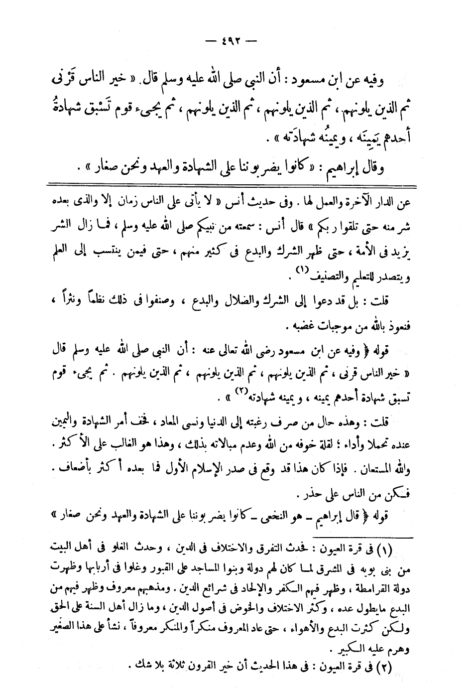 وفيه عن ابن مسعود أن النبي صلى الله عليه وسلم قال: " خير الناس قرني، ثم الذين يلونهم، ثم الذين يلونهم، ثم الذين يلونهم، ثم يجيء قوم تسبق شهادة أحدهم يمينه ويمينه شهادته " 2.
