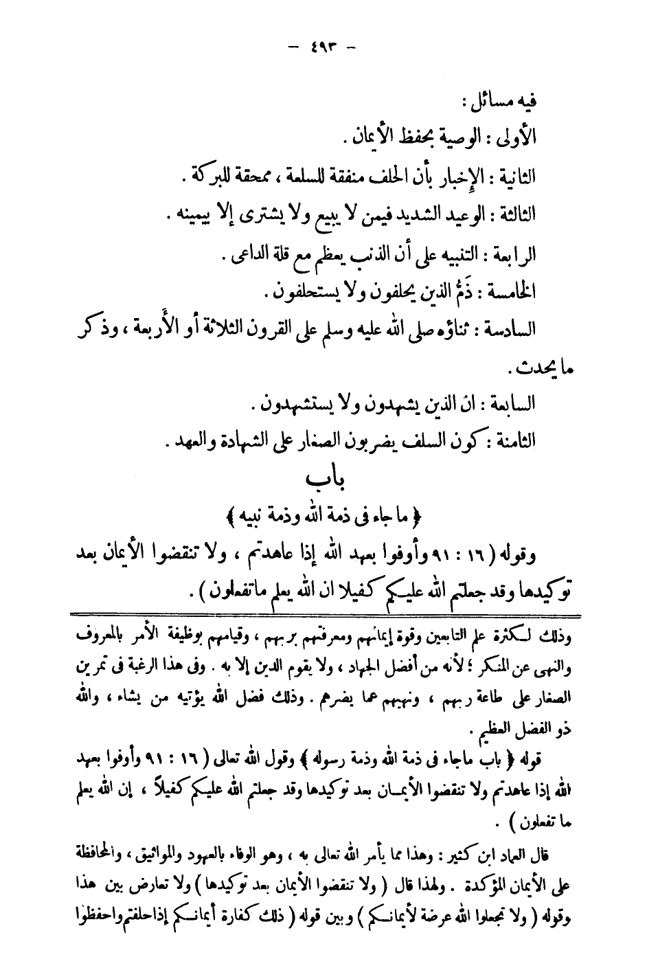 وقوله: {وَأَوْفُوا بِعَهْدِ اللَّهِ إِذَا عَاهَدْتُمْ وَلا تَنْقُضُوا الأَيْمَانَ بَعْدَ تَوْكِيدِهَا وَقَدْ جَعَلْتُمُ اللَّهَ عَلَيْكُمْ كَفِيلاً} 1.