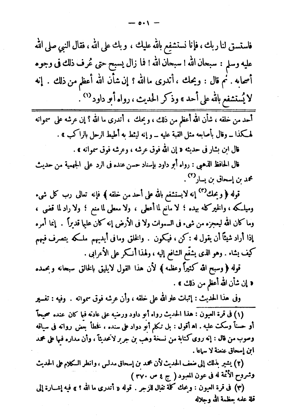 "عن جبير بن محمد بن جبير بن مطعم عن أبيه عن جده قال: " أتى رسول الله صلى الله عليه وسلم أعرابي فقال: يا رسول الله، جهدت الأنفس، وضاعت العيال، ونهكت الأموال، وهلكت الأنعام، فاستسق الله لنا، فإنا نستشفع بك على الله، ونستشفع بالله عليك، قال رسول الله صلى الله عليه وسلم: ويحك، أتدري ما تقول؟ وسبح رسول الله صلى الله عليه وسلم، فما زال يسبح حتى عرف ذلك في وجوه أصحابه، ثم قال: ويحك، إنه لا يستشفع بالله على