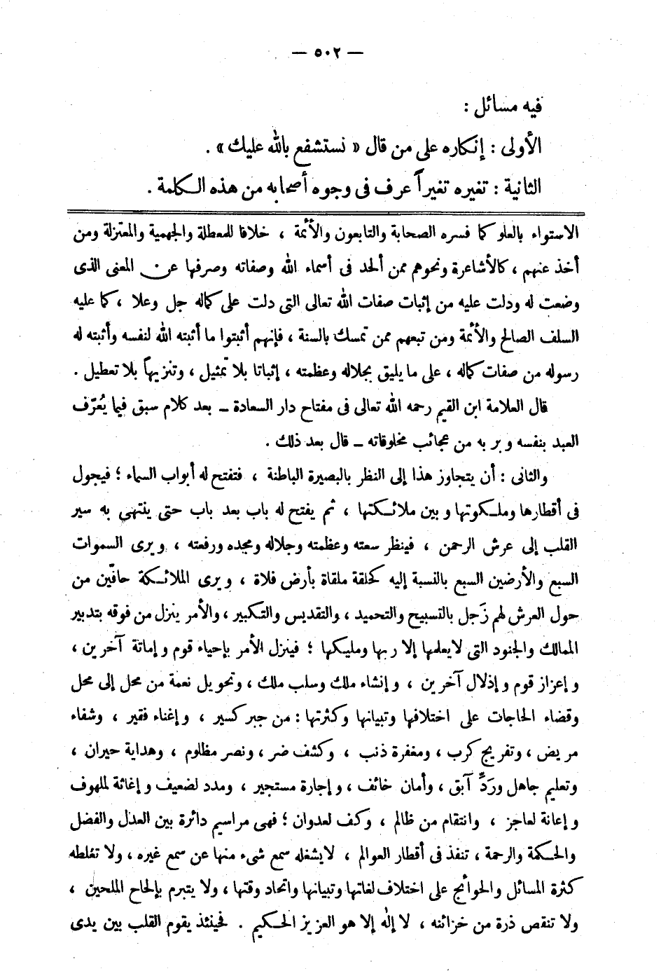 " والثاني: أن يتجاوز هذا إلى النظر بالبصيرة الباطنة فتفتح له أبواب السماء; فيجول في أقطارها وملكوتها وبين ملائكتها، ثم يفتح له باب بعد باب حتى ينتهي به سير القلب إلى عرش الرحمن، فينظر سعته وعظمته وجلاله ومجده ورفعته، ويرى السماوات السبع والأرضين السبع بالنسبة إليه كحلقة ملقاة بأرض فلاة، ويرى الملائكة حافين من حول العرش لهم زجل بالتسبيح والتحميد والتقديس والتكبير، والأمر ينزل من فوقه بتدبير الممالك والجنود التي لا يعلمها إلا ربها ومليكها، فينزل الأمر بإحياء قوم وإماتة آخرين، وإعزاز قوم وإذلال آخرين; وإنشاء ملك وسلب ملك، وتحويل نعمة من محل إلى محل، وقضاء الحاجات على اختلافها وتبيانها وكثرتها: من جبر كسير، وإغناء فقير; وشفاء مريض، وتفريج كرب، ومغفرة ذنب، وكشف ضر ونصر مظلوم، وهداية حيران، وتعليم جاهل، ورد آبق، وأمان خائف، وإجارة مستجير، ومدد لضعيف، وإغاثة لملهوف، وإعانة لعاجز، وانتقام من ظالم، وكف لعدوان، فهي مراسيم دائرة بين العدل والفضل، والحكمة والرحمة، تنفذ في أقطار العوالم، لا يشغله سمع شيء منها عن سمع غيره، ولا تغلطه كثرة المسائل والحوائج على اختلاف لغاتها وتبيانها واتحاد وقتها، ولا يتبرم بإلحاح الملحين، ولا تنقص ذرة من خزائنه، لا إله إلا هو العزيز الحكيم. فحينئذ يقوم القلب بين يدي الرحمن مطرقا لهيئته خاشعا لعظمته عانيا لعزته، فيسجد بين يدي الملك الحق المبين، سجدة لا يرفع رأسه منها إلى يوم المزيد، فهذا سفر القلب، وهو في وطنه وداره ومحل ملكه، وهذا من أعظم آيات الله وعجائب صنعه، فيا له من سفر ما أبركه وأروحه! وأعظم