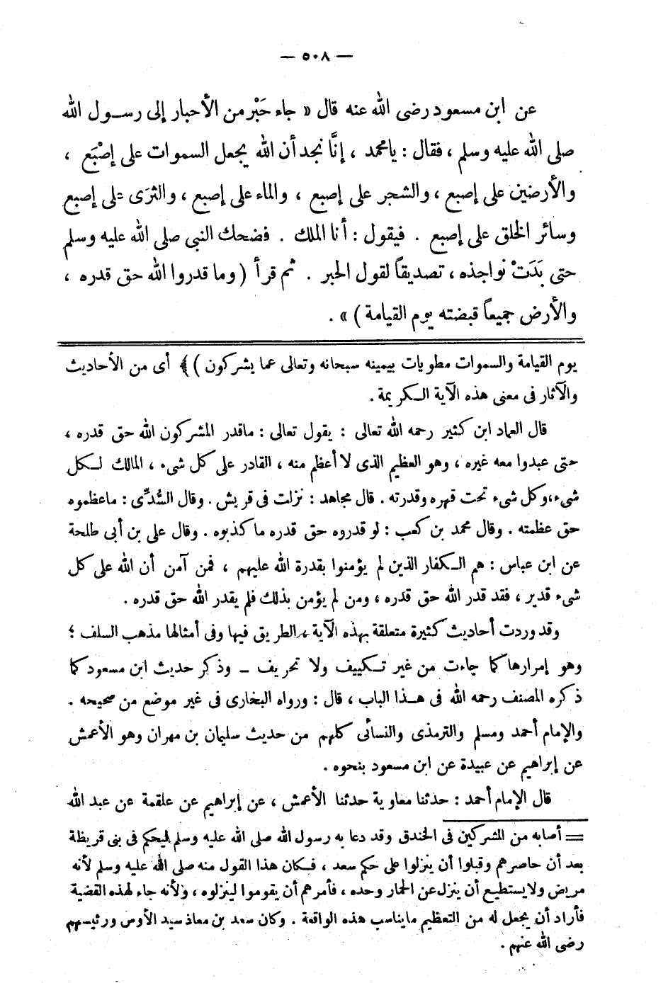 1 البخاري: كتاب التفسير (4811) : باب وما قدروا الله حق قدره كتاب التوحيد: (7414 , 7415) : باب قول الله تعالى: لما خلقت بيدي (7451) باب قول الله تعالى: إن الله يمسك السماوات والأرض أن تزولا (7513) باب كلام الرب عز وجل يوم القيامة مع الأنبياء وغيرهم. ومسلم: كتاب صفات المنافقين (2786) (69) : كتاب صفة القيامة والجنة والنار. وأحمد (1/ 457) . والترمذي: كتاب التفسير (3238) : باب ومن سورة الزمر.