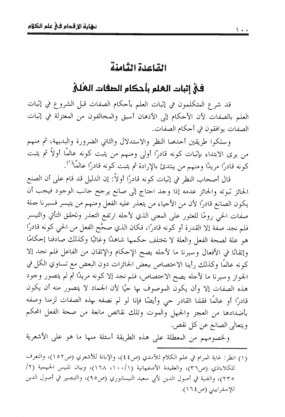 (1) انظر: غاية المرام في علم الكلام للآمدي (ص 44)، والإبانة للأشعري (ص 152)، والتعرف للكلاباذي (ص 36)، والعقيدة الأصفهانية (1/ 100، 168)، وبيان تلبيس الجهمية (2/ 235)، والغنية في أصول الدين لأبي سعيد النيسابوري (ص 95)، والتبصير في أصول الدين للأسفراييني (ص 164).