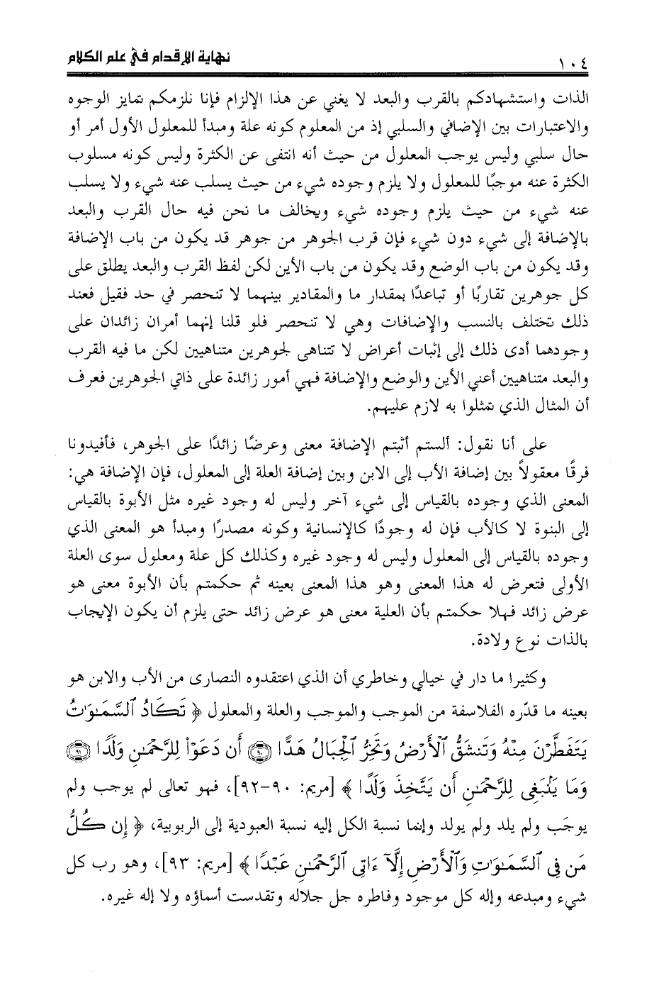 وكثيرا ما دار في خيالي وخاطري أن الذي اعتقدوه النصارى من الأب والابن هو بعينه ما قدّره الفلاسفة من الموجب والموجب والعلة والمعلول تَكادُ السَّماواتُ يَتَفَطَّرْنَ مِنْهُ وَ تَنْشَقُّ الْأَرْضُ وَ تَخِرُّ الْجِبالُ هَدًّا أَنْ دَعَوْا لِلرَّحْمنِ وَلَداً وَ ما يَنْبَغِي لِلرَّحْمنِ أَنْ يَتَّخِذَ وَلَداً [مريم: 90 - 92]، فهو تعالى لم يوجب ولم يوجب ولم يلد ولم يولد وإنما نسبة الكل إليه نسبة العبودية إلى الربوبية، إِنْ كُلُّ مَنْ فِي السَّماواتِ وَ الْأَرْضِ إِلَّا آتِي الرَّحْمنِ عَبْداً [مريم: 93]، وهو رب كل شي ء ومبدعه وإله كل موجود وفاطره جل جلاله وتقدست أسماؤه ولا إله غيره.