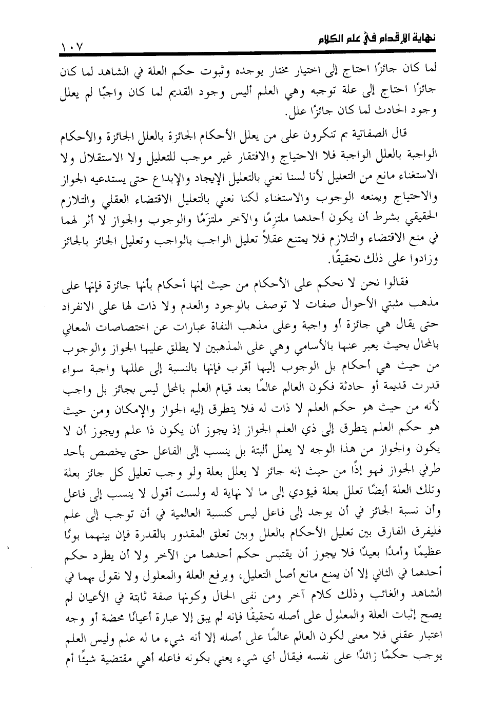 فقالوا نحن لا نحكم على الأحكام من حيث إنها أحكام بأنها جائزة فإنها على مذهب مثبتي الأحوال صفات لا توصف بالوجود والعدم ولا ذات لها على الانفراد حتى يقال هي جائزة أو واجبة وعلى مذهب النفاة عبارات عن اختصاصات المعاني بالمحال بحيث يعبر عنها بالأسامي وهي على المذهبين لا يطلق عليها الجواز والوجوب من حيث هي أحكام بل الوجوب إليها أقرب فإنها بالنسبة إلى عللها واجبة سواء قدرت قديمة أو حادثة فكون العالم عالما بعد قيام العلم بالمحل ليس بجائز بل واجب لأنه من حيث هو حكم العلم لا ذات له فلا يتطرق إليه الجواز والإمكان ومن حيث هو حكم العلم يتطرق إلى ذي العلم الجواز إذ يجوز أن يكون ذا علم ويجوز أن لا يكون والجواز من هذا الوجه لا يعلل البتة بل ينسب إلى الفاعل حتى يخصص بأحد طرفي الجواز فهو إذا من حيث إنه جائز لا يعلل بعلة ولو وجب تعليل كل جائز بعلة وتلك العلة أيضا تعلل بعلة فيؤدي إلى ما لا نهاية له ولست أقول لا ينسب إلى فاعل وأن نسبة الجائز في أن يوجد إلى فاعل ليس كنسبة العالمية في أن توجب إلى علم فليفرق الفارق بين تعليل الأحكام بالعلل وبين تعلق المقدور بالقدرة فإن بينهما بونا عظيما وأمدا بعيدا فلا يجوز أن يقتبس حكم أحدهما من الآخر ولا أن يطرد حكم أحدهما في الثاني إلا أن يمنع مانع أصل التعليل، ويرفع العلة والمعلول ولا نقول بهما في الشاهد والغائب وذلك كلام آخر ومن نفى الحال وكونها صفة ثابتة في الأعيان لم يصح إثبات العلة والمعلول على أصله تحقيقا فإنه لم يبق إلا عبارة أعيانا محضة أو وجه اعتبار عقلي فلا معنى لكون العالم عالما على أصله إلا أنه شي ء ما له علم وليس العلم يوجب حكما زائدا على نفسه فيقال أي شي ء يعني بكونه فاعله أ هي مقتضية شيئا أم