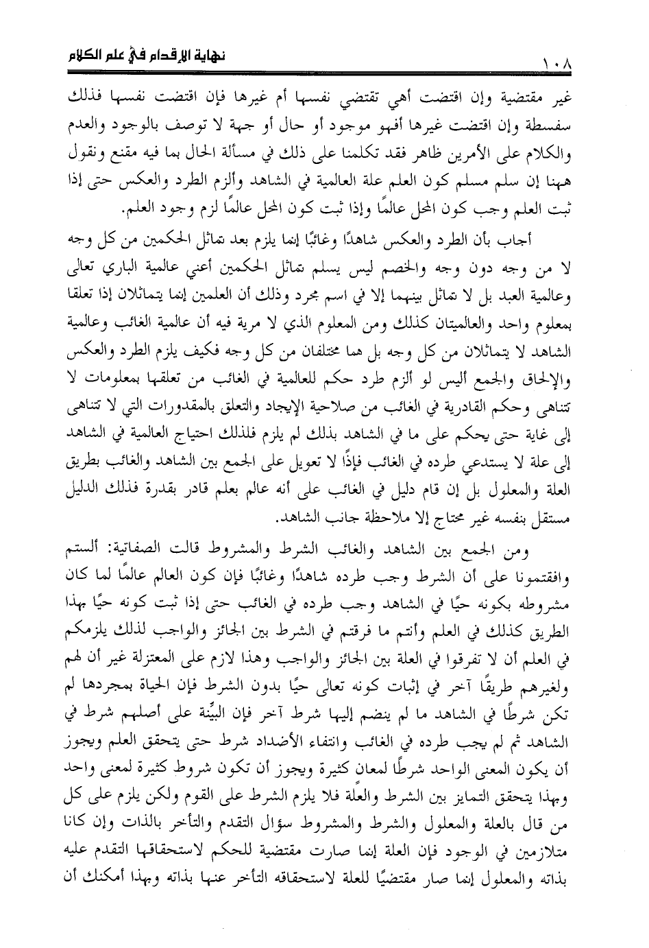 غير مقتضية وإن اقتضت أ هي تقتضي نفسها أم غيرها فإن اقتضت نفسها فذلك سفسطة وإن اقتضت غيرها أ فهو موجود أو حال أو جهة لا توصف بالوجود والعدم والكلام على الأمرين ظاهر فقد تكلمنا على ذلك في مسألة الحال بما فيه مقنع ونقول هاهنا إن سلم مسلم كون العلم علة العالمية في الشاهد وألزم الطرد والعكس حتى إذا ثبت العلم وجب كون المحل عالما وإذا ثبت كون المحل عالما لزم وجود العلم.