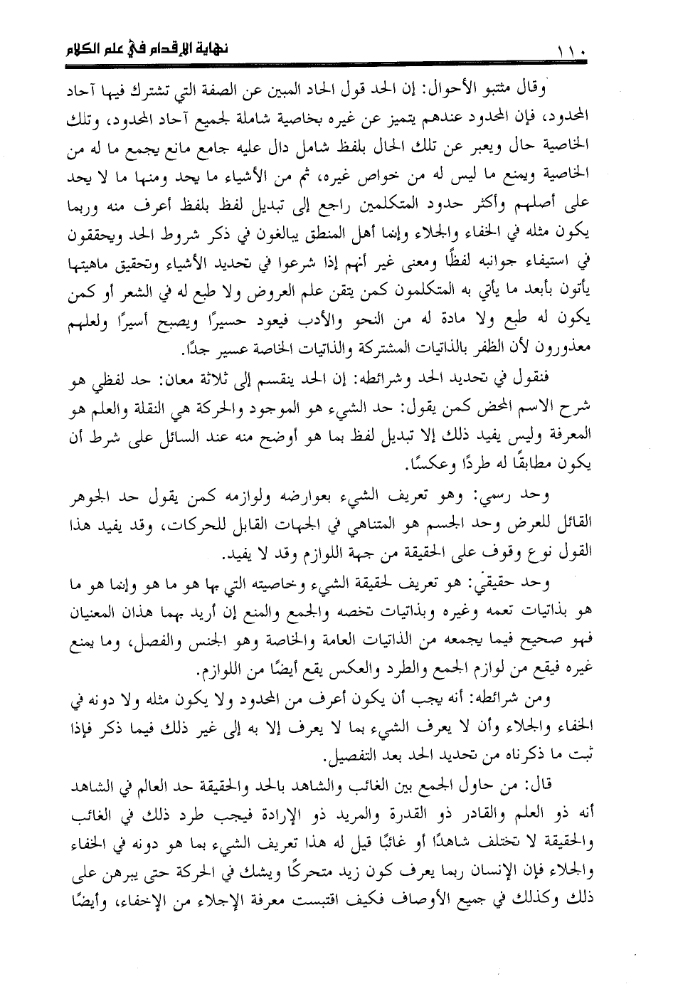 وقال مثبتو الأحوال: إن الحد قول الحاد المبين عن الصفة التي تشترك فيها آحاد المحدود، فإن المحدود عندهم يتميز عن غيره بخاصية شاملة لجميع آحاد المحدود، وتلك الخاصية حال ويعبر عن تلك الحال بلفظ شامل دال عليه جامع مانع يجمع ما له من الخاصية ويمنع ما ليس له من خواص غيره، ثم من الأشياء ما يحد ومنها ما لا يحد على أصلهم وأكثر حدود المتكلمين راجع إلى تبديل لفظ بلفظ أعرف منه وربما يكون مثله في الخفاء والجلاء وإنما أهل المنطق يبالغون في ذكر شروط الحد ويحققون في استيفاء جوانبه لفظا ومعنى غير أنهم إذا شرعوا في تحديد الأشياء وتحقيق ماهيتها يأتون بأبعد ما يأتي به المتكلمون كمن يتقن علم العروض ولا طبع له في الشعر أو كمن يكون له طبع ولا مادة له من النحو والأدب فيعود حسيرا ويصبح أسيرا ولعلهم معذورون لأن الظفر بالذاتيات المشتركة والذاتيات الخاصة عسير جدا.