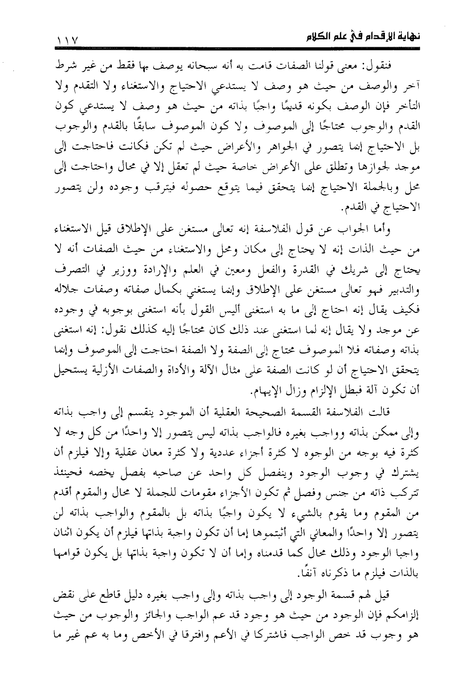وأما الجواب عن قول الفلاسفة إنه تعالى مستغن على الإطلاق قيل الاستغناء من حيث الذات إنه لا يحتاج إلى مكان ومحل والاستغناء من حيث الصفات أنه لا يحتاج إلى شريك في القدرة والفعل ومعين في العلم والإرادة ووزير في التصرف والتدبير فهو تعالى مستغن على الإطلاق وإنما يستغني بكمال صفاته وصفات جلاله فكيف يقال إنه احتاج إلى ما به استغنى أ ليس القول بأنه استغنى بوجوبه في وجوده عن موجد ولا يقال إنه لما استغنى عند ذلك كان محتاجا إليه كذلك نقول: إنه استغنى بذاته وصفاته فلا الموصوف محتاج إلى الصفة ولا الصفة احتاجت إلى الموصوف وإنما يتحقق الاحتياج أن لو كانت الصفة على مثال الآلة والأداة والصفات الأزلية يستحيل أن تكون آلة فبطل الإلزام وزال الإيهام.