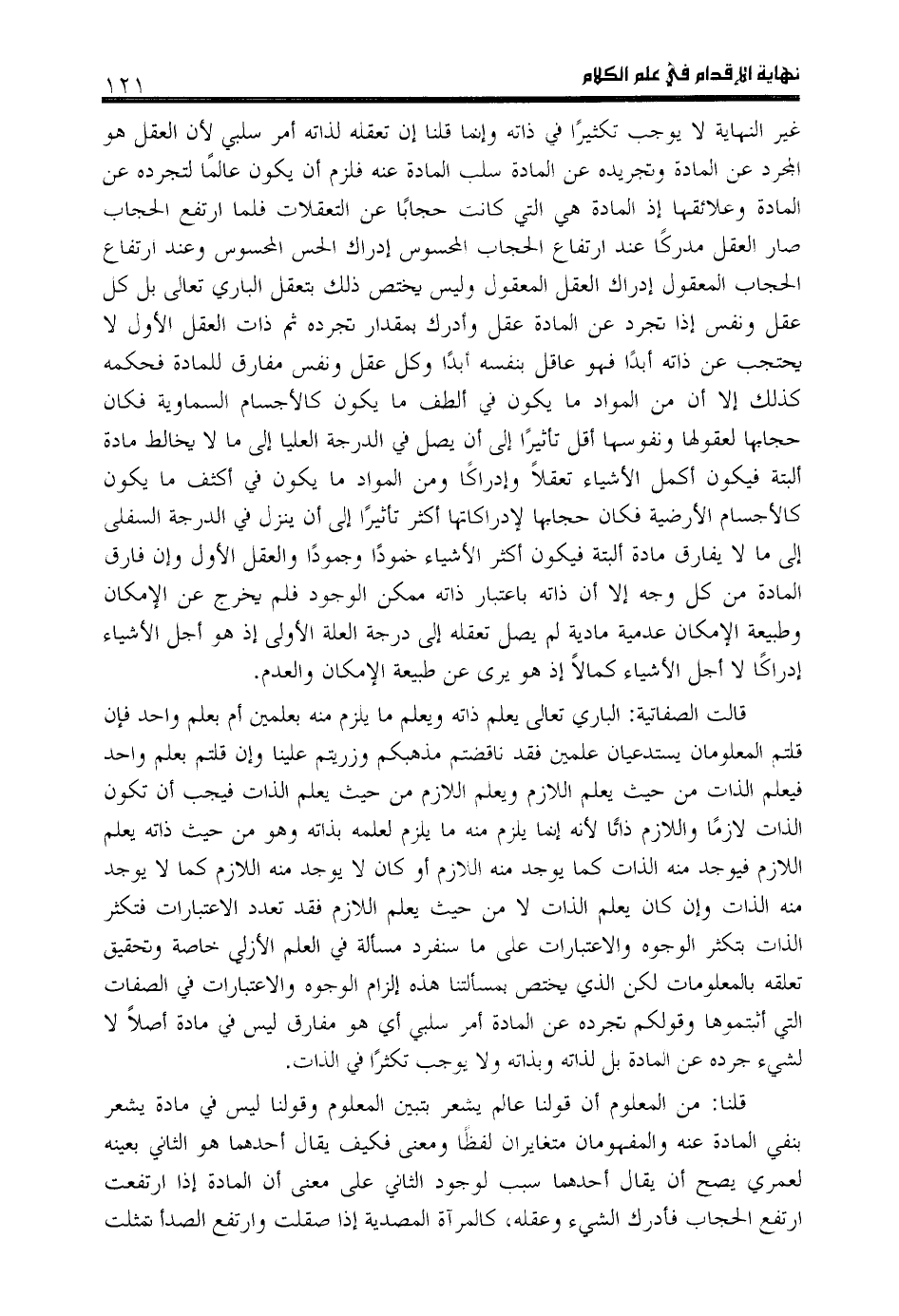 غير النهاية لا يوجب تكثيرا في ذاته وإنما قلنا إن تعقله لذاته أمر سلبي لأن العقل هو المجرد عن المادة وتجريده عن المادة سلب المادة عنه فلزم أن يكون عالما لتجرده عن المادة وعلائقها إذ المادة هي التي كانت حجابا عن التعقلات فلما ارتفع الحجاب صار العقل مدركا عند ارتفاع الحجاب المحسوس إدراك الحس المحسوس وعند ارتفاع الحجاب المعقول إدراك العقل المعقول وليس يختص ذلك بتعقل الباري تعالى بل كل عقل ونفس إذا تجرد عن المادة عقل وأدرك بمقدار تجرده ثم ذات العقل الأول لا يحتجب عن ذاته أبدا فهو عاقل بنفسه أبدا وكل عقل ونفس مفارق للمادة فحكمه كذلك إلا أن من المواد ما يكون في ألطف ما يكون كالأجسام السماوية فكان حجابها لعقولها ونفوسها أقل تأثيرا إلى أن يصل في الدرجة العليا إلى ما لا يخالط مادة البتة فيكون أكمل الأشياء تعقلا وإدراكا ومن المواد ما يكون في أكثف ما يكون كالأجسام الأرضية فكان حجابها لإدراكاتها أكثر تأثيرا إلى أن ينزل في الدرجة السفلى إلى ما لا يفارق مادة البتة فيكون أكثر الأشياء خمودا وجمودا والعقل الأول وإن فارق المادة من كل وجه إلا أن ذاته باعتبار ذاته ممكن الوجود فلم يخرج عن الإمكان وطبيعة الإمكان عدمية مادية لم يصل تعقله إلى درجة العلة الأولى إذ هو أجل الأشياء إدراكا لا أجل الأشياء كمالا إذ هو يرى عن طبيعة الإمكان والعدم.