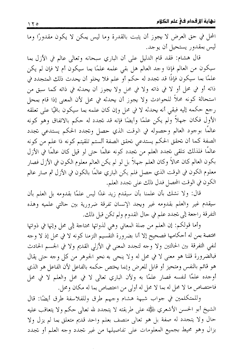 قال هشام: فقد قام الدليل على أن الباري سبحانه وتعالى عالم في الأزل بما سيكون من العالم فإذا وجد العالم هل بقي علمه علما بما سيكون أم لا فإن لم يكن علما بما سيكون فإذا قد تجدد له حكم أو علم فلا يخلو أن يحدث ذلك المتجدد في ذاته أو في محل أو لا في ذاته ولا في محل ولا يجوز أن يحدثه في ذاته كما سبق من استحالة كونه محلا للحوادث ولا يجوز أن يحدثه في محل لأن المعنى إذا قام بمحل رجع حكمه إليه فبقي أنه يحدثه لا في محل وإن كان علمه بما سيكون باقيا على تعلقه الأول فكان جهلا ولم يكن علما وأيضا فإنه قد تجدد له حكم بالاتفاق وهو كونه عالما بوجود العالم وحصوله في الوقت الذي حصل وتجدد الحكم يستدعي تجدد الصفة كما أن تحقق الحكم يستدعي تحقق الصفة أ لستم تلقيتم كونه ذا علم من كونه عالما فلذلك نتلقى تجدد العلم من تجدد كونه عالما حتى لو قيل كان عالما في الأزل بكون العالم كان محالا وكان العلم جهلا بل لو لم يكن العالم معلوم الكون في الأزل فصار معلوم الكون في الوقت الذي حصل فلم يكن الباري عالما بالكون في الأزل ثم صار عالم الكون في الوقت المحصل فدل ذلك على تجدد العلم.