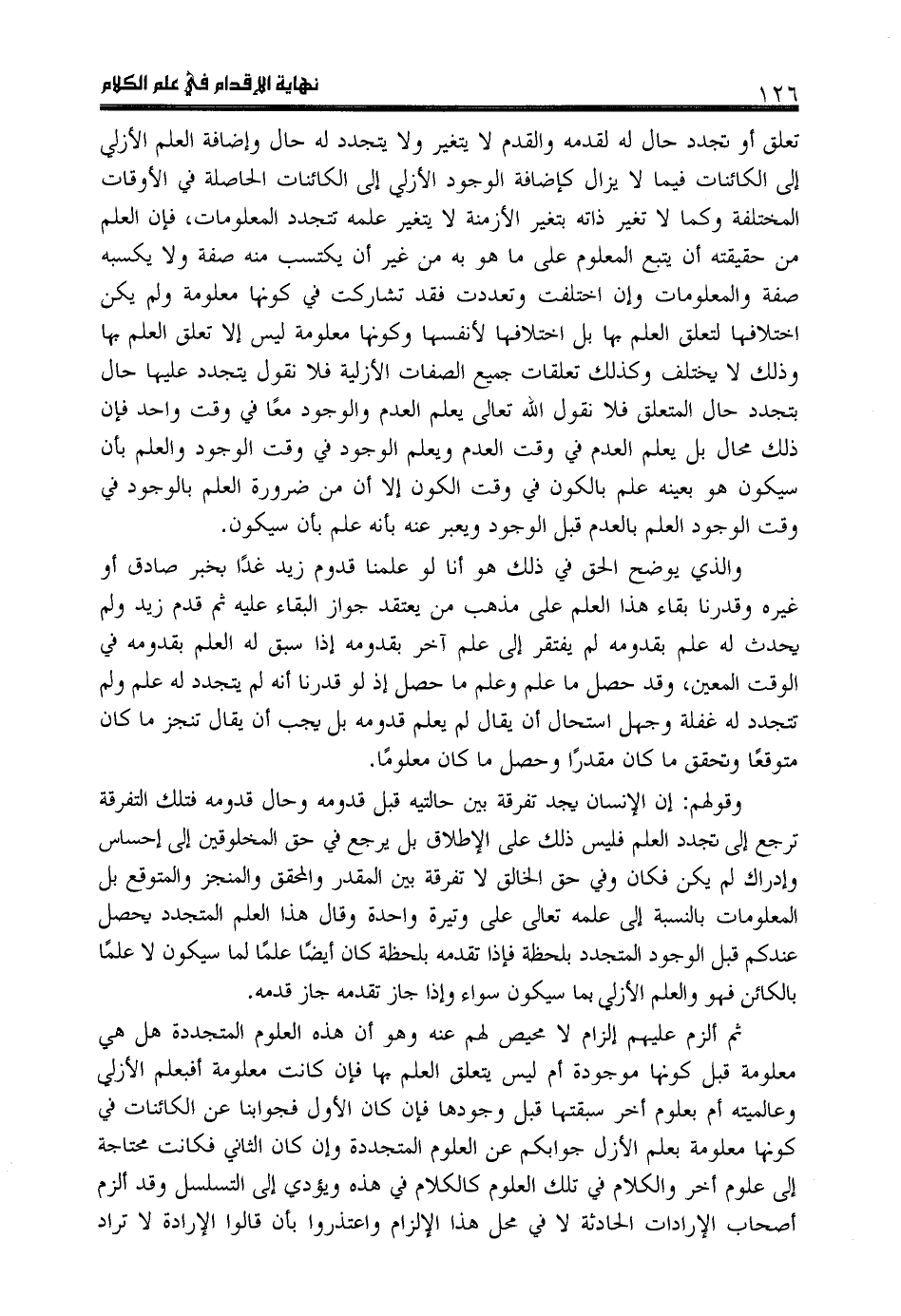 ثم ألزم عليهم إلزام لا محيص لهم عنه وهو أن هذه العلوم المتجددة هل هي معلومة قبل كونها موجودة أم ليس يتعلق العلم بها فإن كانت معلومة أ فبعلم الأزلي وعالميته أم بعلوم أخر سبقتها قبل وجودها فإن كان الأول فجوابنا عن الكائنات في كونها معلومة بعلم الأزل جوابكم عن العلوم المتجددة وإن كان الثاني فكانت محتاجة إلى علوم أخر والكلام في تلك العلوم كالكلام في هذه ويؤدي إلى التسلسل وقد ألزم أصحاب الإرادات الحادثة لا في محل هذا الإلزام واعتذروا بأن قالوا الإرادة لا تراد
