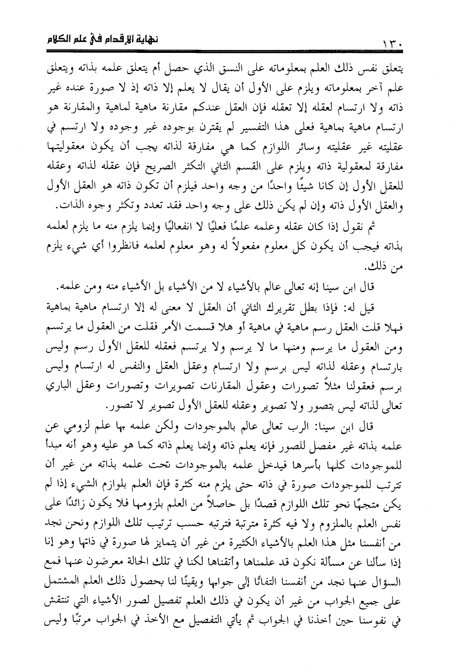 قال ابن سينا: الرب تعالى عالم بالموجودات ولكن علمه بها علم لزومي عن علمه بذاته غير مفصل للصور فإنه يعلم ذاته وإنما يعلم ذاته كما هو عليه وهو أنه مبدأ للموجودات كلها بأسرها فيدخل علمه بالموجودات تحت علمه بذاته من غير أن تترتب للموجودات صورة في ذاته حتى يلزم منه كثرة فإن العلم بلوازم الشي ء إذا لم يكن متجها نحو تلك اللوازم قصدا بل حاصلا من العلم بلزومها فلا يكون زائدا على نفس العلم بالملزوم ولا فيه كثرة مترتبة فترتبه حسب ترتيب تلك اللوازم ونحن نجد من أنفسنا مثل هذا العلم بالأشياء الكثيرة من غير أن يتمايز لها صورة في ذاتها وهو إنا إذا سألنا عن مسألة نكون قد علمناها وأتقناها لكنا في تلك الحالة معرضون عنها فمع السؤال عنها نجد من أنفسنا التفاتا إلى جوابها ويقينا لنا بحصول ذلك العلم المشتمل على جميع الجواب من غير أن يكون في ذلك العلم تفصيل لصور الأشياء التي تنتقش في نفوسنا حين أخذنا في الجواب ثم يأتي التفصيل مع الأخذ في الجواب مرتبا وليس
