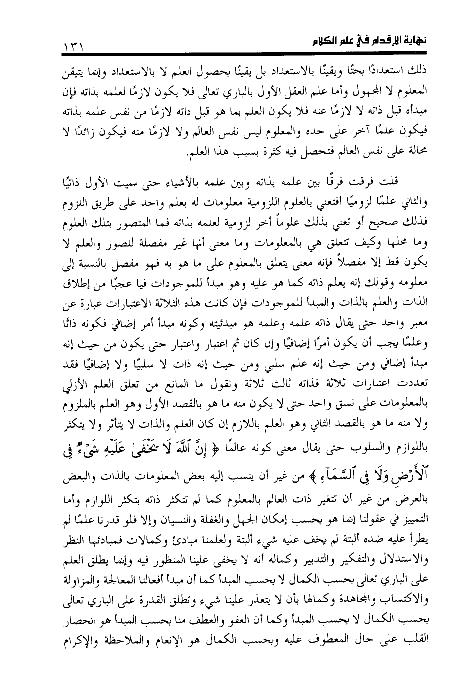 قلت فرقت فرقا بين علمه بذاته وبين علمه بالأشياء حتى سميت الأول ذاتيا والثاني علما لزوميا أ فتعني بالعلوم اللزومية معلومات له بعلم واحد على طريق اللزوم فذلك صحيح أو تعني بذلك علوما أخر لزومية لعلمه بذاته فما المتصور بتلك العلوم وما محلها وكيف تتعلق هي بالمعلومات وما معنى أنها غير مفصلة للصور والعلم لا يكون قط إلا مفصلا فإنه معنى يتعلق بالمعلوم على ما هو به فهو مفصل بالنسبة إلى معلومه وقولك إنه يعلم ذاته كما هو عليه وهو مبدأ للموجودات فيا عجبا من إطلاق الذات والعلم بالذات والمبدأ للموجودات فإن كانت هذه الثلاثة الاعتبارات عبارة عن معبر واحد حتى يقال ذاته علمه وعلمه هو مبدئيته وكونه مبدأ أمر إضافي فكونه ذاتا وعلما يجب أن يكون أمرا إضافيا وإن كان ثم اعتبار واعتبار حتى يكون من حيث إنه مبدأ إضافي ومن حيث إنه علم سلبي ومن حيث إنه ذات لا سلبيا ولا إضافيا فقد تعددت اعتبارات ثلاثة فذاته ثالث ثلاثة ونقول ما المانع من تعلق العلم الأزلي بالمعلومات على نسق واحد حتى لا يكون منه ما هو بالقصد الأول وهو العلم بالملزوم ولا منه ما هو بالقصد الثاني وهو العلم باللازم إن كان العلم والذات لا يتأثر ولا يتكثر باللوازم والسلوب حتى يقال معنى كونه عالما إِنَّ اللَّهَ لا يَخْفى عَلَيْهِ شَيْ ءٌ فِي الْأَرْضِ وَ لا فِي السَّماءِ من غير أن ينسب إليه بعض المعلومات بالذات والبعض بالعرض من غير أن تتغير ذات العالم بالمعلوم كما لم تتكثر ذاته بتكثر اللوازم وأما التمييز في عقولنا إنما هو بحسب إمكان الجهل والغفلة والنسيان وإلا فلو قدرنا علما لم يطرأ عليه ضده البتة لم يخف عليه شي ء البتة ولعلمنا مبادئ وكمالات فمبادئها النظر والاستدلال والتفكير والتدبير وكماله أنه لا يخفى علينا المنظور فيه وإنما يطلق العلم على الباري تعالى بحسب الكمال لا بحسب المبدأ كما أن مبدأ أفعالنا المعالجة والمزاولة والاكتساب والمجاهدة وكمالها بأن لا يتعذر علينا شي ء وتطلق القدرة على الباري تعالى بحسب الكمال لا بحسب المبدأ وكما أن العفو والعطف منا بحسب المبدأ هو انحصار القلب على حال المعطوف عليه وبحسب الكمال هو الإنعام والملاحظة والإكرام