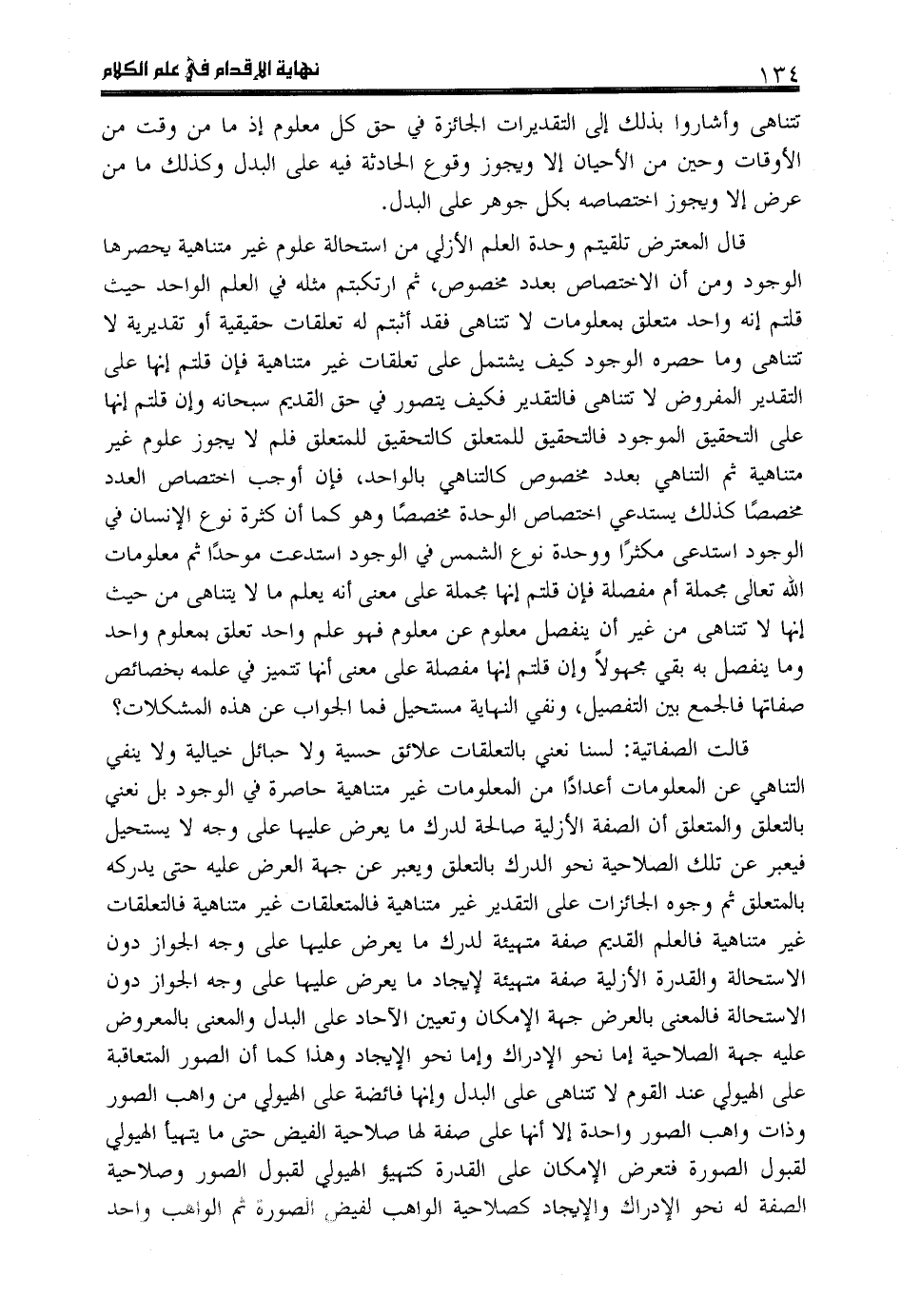قال المعترض تلقيتم وحدة العلم الأزلي من استحالة علوم غير متناهية يحصرها الوجود ومن أن الاختصاص بعدد مخصوص، ثم ارتكبتم مثله في العلم الواحد حيث قلتم إنه واحد متعلق بمعلومات لا تتناهى فقد أثبتم له تعلقات حقيقية أو تقديرية لا تتناهى وما حصره الوجود كيف يشتمل على تعلقات غير متناهية فإن قلتم إنها على التقدير المفروض لا تتناهى فالتقدير فكيف يتصور في حق القديم سبحانه وإن قلتم إنها على التحقيق الموجود فالتحقيق للمتعلق كالتحقيق للمتعلق فلم لا يجوز علوم غير متناهية ثم التناهي بعدد مخصوص كالتناهي بالواحد، فإن أوجب اختصاص العدد مخصصا كذلك يستدعي اختصاص الوحدة مخصصا وهو كما أن كثرة نوع الإنسان في الوجود استدعى مكثرا ووحدة نوع الشمس في الوجود استدعت موحدا ثم معلومات اللّه تعالى مجملة أم مفصلة فإن قلتم إنها مجملة على معنى أنه يعلم ما لا يتناهى من حيث إنها لا تتناهى من غير أن ينفصل معلوم عن معلوم فهو علم واحد تعلق بمعلوم واحد وما ينفصل به بقي مجهولا وإن قلتم إنها مفصلة على معنى أنها تتميز في علمه بخصائص صفاتها فالجمع بين التفصيل، ونفي النهاية مستحيل فما الجواب عن هذه المشكلات؟