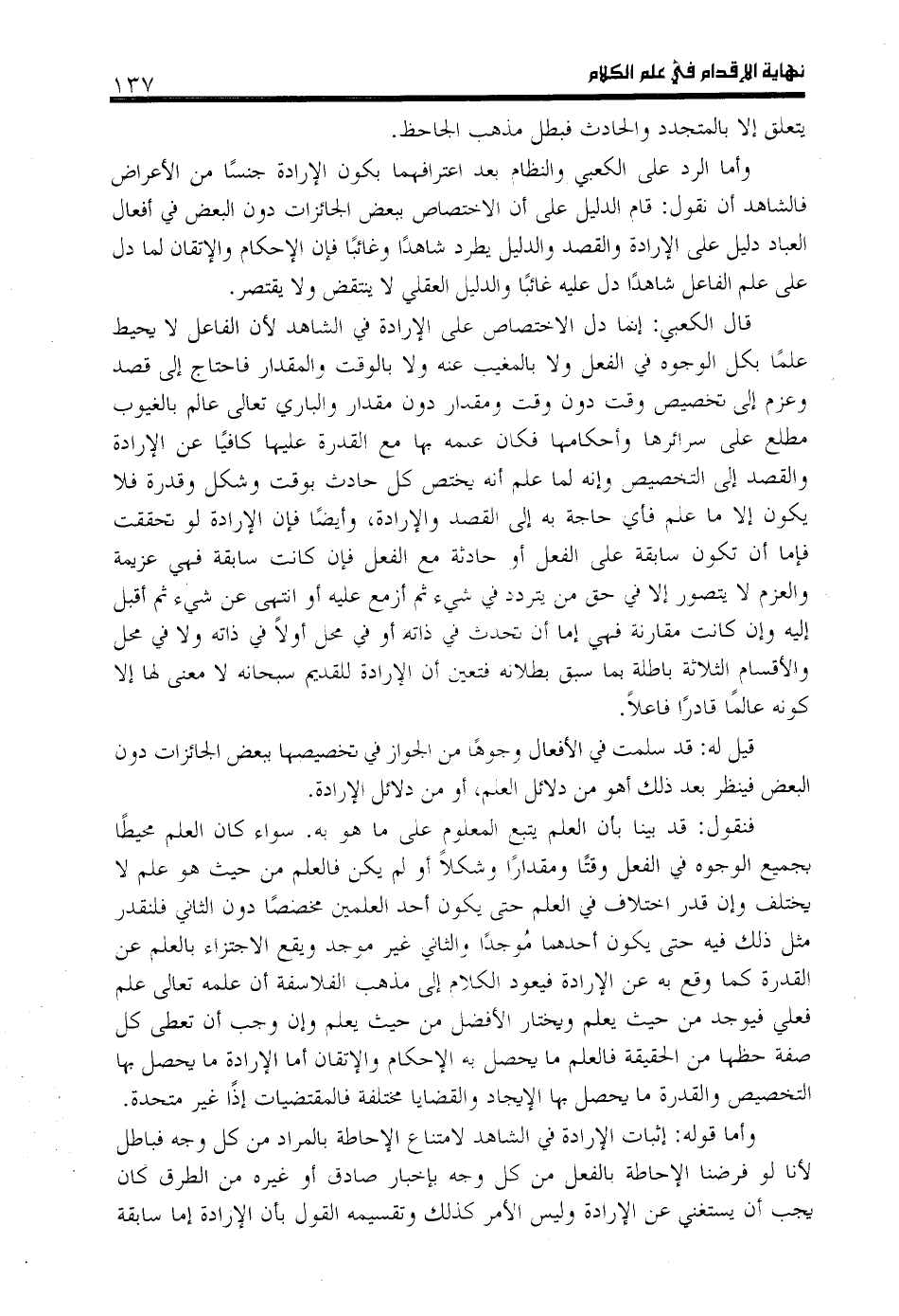 قال الكعبي: إنما دل الاختصاص على الإرادة في الشاهد لأن الفاعل لا يحيط علما بكل الوجوه في الفعل ولا بالمغيب عنه ولا بالوقت والمقدار فاحتاج إلى قصد وعزم إلى تخصيص وقت دون وقت ومقدار دون مقدار والباري تعالى عالم بالغيوب مطلع على سرائرها وأحكامها فكان علمه بها مع القدرة عليها كافيا عن الإرادة والقصد إلى التخصيص وإنه لما علم أنه يختص كل حادث بوقت وشكل وقدرة فلا يكون إلا ما علم فأي حاجة به إلى القصد والإرادة، وأيضا فإن الإرادة لو تحققت فإما أن تكون سابقة على الفعل أو حادثة مع الفعل فإن كانت سابقة فهي عزيمة والعزم لا يتصور إلا في حق من يتردد في شي ء ثم أزمع عليه أو انتهى عن شي ء ثم أقبل إليه وإن كانت مقارنة فهي إما أن تحدث في ذاته أو في محل أولا في ذاته ولا في محل والأقسام الثلاثة باطلة بما سبق بطلانه فتعين أن الإرادة للقديم سبحانه لا معنى لها إلا كونه عالما قادرا فاعلا.