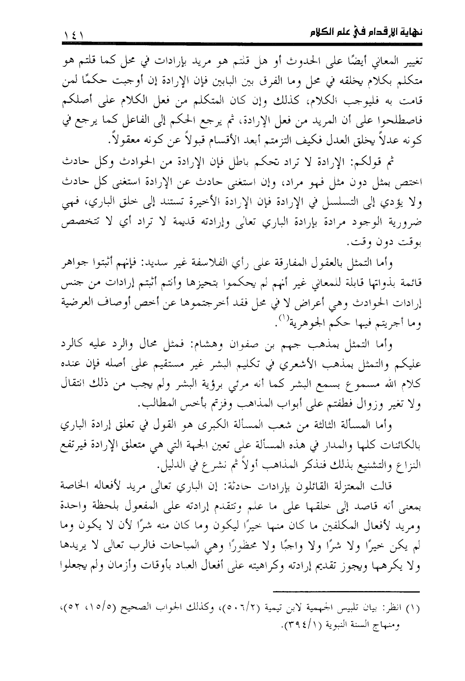 وأما المسألة الثالثة من شعب المسألة الكبرى هو القول في تعلق إرادة الباري بالكائنات كلها والمدار في هذه المسألة على تعين الجهة التي هي متعلق الإرادة فيرتفع النزاع والتشنيع بذلك فنذكر المذاهب أولا ثم نشرع في الدليل.