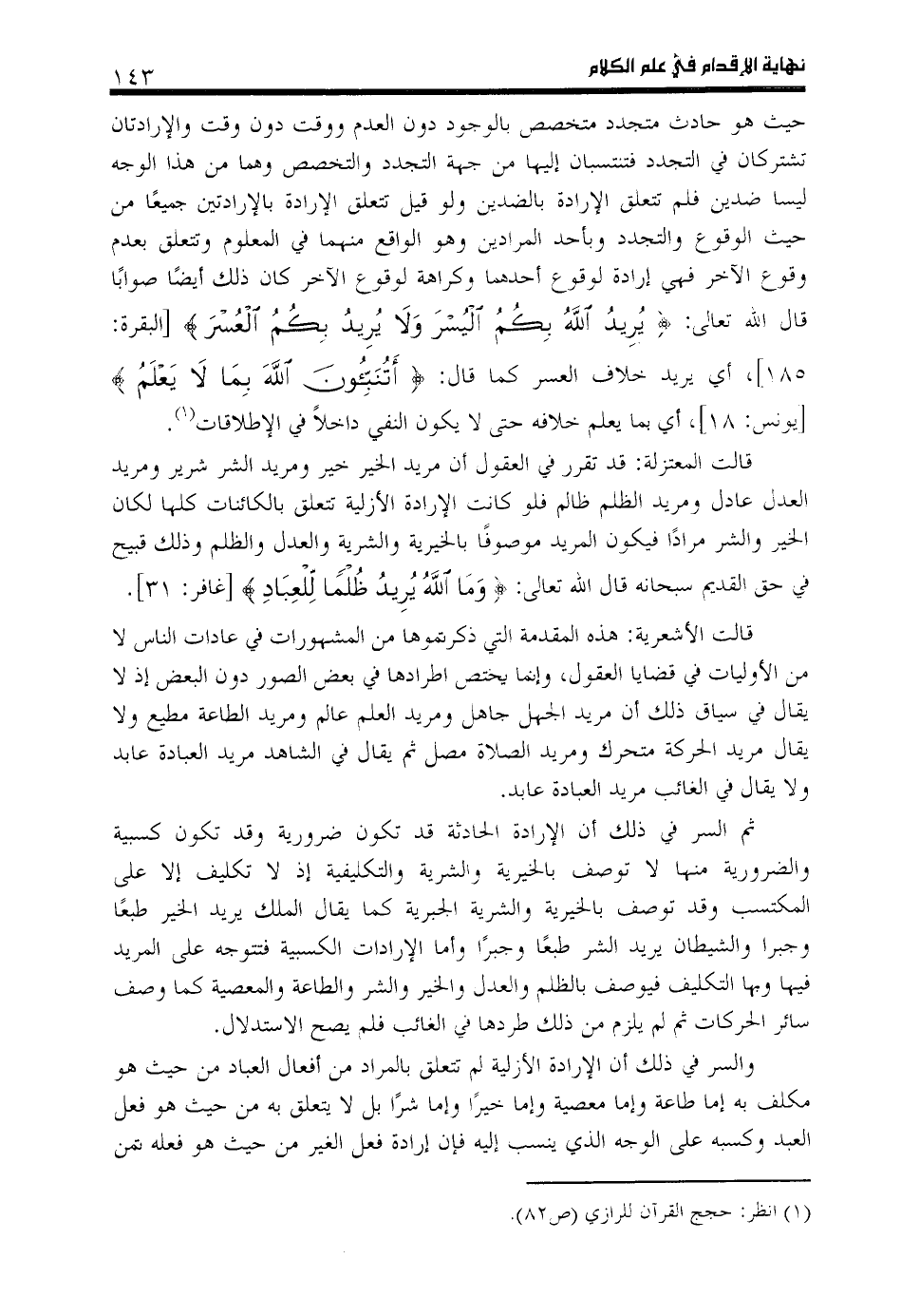 ثم السر في ذلك أن الإرادة الحادثة قد تكون ضرورية وقد تكون كسبية والضرورية منها لا توصف بالخيرية والشرية والتكليفية إذ لا تكليف إلا على المكتسب وقد توصف بالخيرية والشرية الجبرية كما يقال الملك يريد الخير طبعا وجبرا والشيطان يريد الشر طبعا وجبرا وأما الإرادات الكسبية فتتوجه على المريد فيها وبها التكليف فيوصف بالظلم والعدل والخير والشر والطاعة والمعصية كما وصف سائر الحركات ثم لم يلزم من ذلك طردها في الغائب فلم يصح الاستدلال.