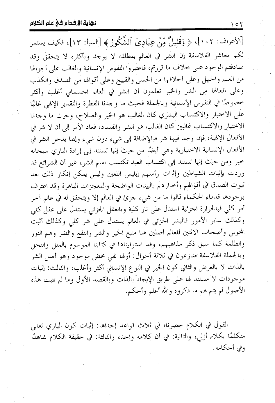 [الأعراف: 102]، وَ قَلِيلٌ مِنْ عِبادِيَ الشَّكُورُ [السبأ: 13]، فكيف يستمر لكم معاشر الفلاسفة إن الشر في العالم بمطلقه لا يوجد وبأكثره لا يتحقق وقد صادفتم الوجود على خلاف ما قررتم، فاعتبروا النفوس الإنسانية والغالب على أحوالها من العلم والجهل وعلى أخلاقها من الحسن والقبيح وعلى أقوالها من الصدق والكذب وعلى أفعالها من الشر والخير تعلمون أن الشر في العالم الجسماني أغلب وأكثر خصوصا في النفوس الإنسانية وبالجملة فحيث ما وجدنا الفطرة والتقدير الإلهي غالبا على الاختيار والاكتساب البشري كان الغالب هو الخير والصلاح، وحيث ما وجدنا الاختيار والاكتساب غالبين كان الغالب هو الشر والفساد، فعاد الأمر إلى أن لا شر في الأفعال الإلهية، فإن وجد فيها شر فبالإضافة إلى شي ء دون شي ء وإنما يدخل الشر في الأفعال الإنسانية الاختيارية وهي أيضا من حيث إنها تستند إلى إرادة الباري سبحانه خير ومن حيث إنها تستند إلى اكتساب العبد تكتسب اسم الشر، غير أن الشرائع قد وردت بإثبات الشياطين وإثبات رأسهم إبليس اللعين وليس يمكن إنكار ذلك بعد ثبوت الصدق في أقوالهم وأخبارهم بالبينات الواضحة والمعجزات الباهرة وقد اعترف بوجودها قدماء الحكماء قالوا ما من شي ء جزئ في العالم إلا ويتحقق له في عالم آخر أمر كلي فبالحرارة الجزئية استدل على نار كلية وبالعقل الجزئي يستدل على عقل كلي وكذلك ساير الأمور فالبشر الجزئي في العالم يستدل على شر كلي وكذلك أثبت المجوس وأصحاب الاثنين للعالم أصلين هما منبع الخير والشر والنفع والضر وهم النور والظلمة كما سبق ذكر مذاهبهم، وقد استوفيناها في كتابنا الموسوم بالملل والنحل وبالجملة الفلاسفة منازعون في ثلاثة أحوال: أولها نفي محض موجود وهو أصل الشر بالذات لا بالعرض والثاني كون الخير في النوع الإنساني أكثر وأغلب، والثالث: إثبات موجودات لا مستند لها على طريق الإيجاد بالذات وبالقصد الأول وما لم تثبت هذه الأصول لم يتم لهم ما ذكروه واللّه أعلم وأحكم.