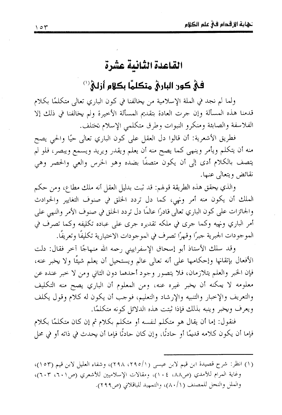 القاعدة الثانية عشرة في كون الباري متكلما بكلام أزلي «1»