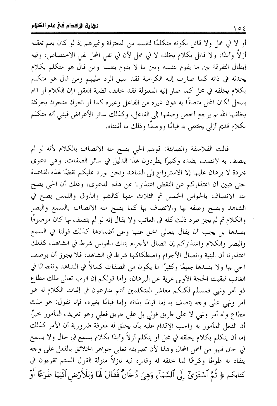 قالت الفلاسفة والصابئة: قولهم الحي يصح منه الاتصاف بالكلام لأنه لو لم يتصف به لا تصف بضده وكثيرا يطردون هذا الدليل في سائر الصفات، وهي دعوى مجردة لا برهان عليها إلا الاسترواح إلى الشاهد ونحن نورد عليكم نقضا لهذه القاعدة حتى يتبين أن اعتذاركم عن النقض اعتذارنا عن هذه الدعوى، وذلك أن الحي يصح منه الاتصاف بالحواس الخمس ثم الثلاث منها كالشم والذوق واللمس يصح في الشاهد ويصح وصفه بها والاتصاف بها كما يصح منه الاتصاف بالسمع والبصر والكلام ثم لم يجز طرد ذلك كله في الغائب ولا يقال إنه لو لم يتصف بها كان موصوفا بضدها بل يجب أن يقال يتعالى الحق عنها وعن أضدادها كذلك قولنا في السمع والبصر والكلام واعتذاركم إن اتصال الأجرام بتلك الحواس شرط في الشاهد، كذلك اعتذارنا أن البنية واتصال الأجرام واصطكاكها شرط في الشاهد، فلا يجوز أن يوصف الحي بها ولا بضدها جميعا وكثيرا ما يكون من الصفات كمالا في الشاهد ونقصانا في الغائب فبقيت الحجة الأولى عرية عن البرهان، وأما قولكم إن الرب تعالى ملك مطاع ذو أمر ونهي فمسلم لكنكم معاشر المتكلمين أنتم منازعون في إثبات الكلام له هو أمر ونهي على وجه يتصف به إما قياما بذاته وإما قياما بغيره، فإنا نقول: هو ملك مطاع وله أمر ونهي لا على طريق قولي بل على طريق فعلي وهو تعريف المأمور خبرا أن الفعل المأمور به واجب الإقدام عليه بأن يخلق له معرفة ضرورية أن الأمر كذلك إما أن يتكلم بكلام يخلقه في محل أو يتكلم أزلا وأبدا بكلام يسمع في حال ولا يسمع في حال فهو من أمحل المحال وهذا لأن تصريفه تعالى جواهر الخلائق بالفعل على وجه ينقاد له طوعا وكرها لما خلقه له وقدره فيه نازلا منزلة القول أ لستم تقرءون في كتابكم ثُمَّ اسْتَوى إِلَى السَّماءِ وَ هِيَ دُخانٌ فَقالَ لَها وَ لِلْأَرْضِ ائْتِيا طَوْعاً أَوْ