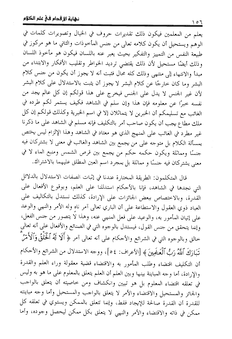 قال المتكلمون: الطريقة المختارة عندنا في إثبات الصفات الاستدلال بالدلائل التي نجدها في الشاهد، فإنا بالأحكام استدللنا على العلم، وبوقوع الأفعال على القدرة، وبالاختصاص ببعض الجائزات على الإرادة، كذلك نستدل بالتكاليف على العباد ذوي العقول والاستطاعة على أن الباري تعالى آمر ناه وله الأمر والنهي والوعد على إتيان المأمور به، والوعيد على فعل المنهي عنه، وهذا لا يتصور من جنس الفعل، وإنما يتحقق من جنس القول، فيستدل بالوجوه التي في الصنائع والأفعال على أنه تعالى خالق وبالوجوه التي في الشرائع والأحكام على أنه تعالى آمر أَلا لَهُ الْخَلْقُ وَ الْأَمْرُ تَبارَكَ اللَّهُ رَبُّ الْعالَمِينَ [الأعراف: 54]، ووجه الاستدلال من الشرائع والأحكام أن التكليف اقتضاء وطلب المأمور به والاقتضاء قضية معقولة وراء العلم والقدرة والإرادة، أما وجه المباينة بينها وبين العلم أن العلم يتعلق بالمعلوم على ما هو به وليس في تعلقه اقتضاء المعلوم بل هو تبيين وانكشاف ومن خاصيته أن يتعلق بالواجب والجائز والمستحيل والاقتضاء والأمر لا يتعلق بالواجب والمستحيل وأما وجه مباينته للقدرة أن القدرة صالحة للإيجاد فقط، وإنما تتعلق بالممكن ويستوي في تعلقه كل ممكن في ذاته والاقتضاء والأمر والنهي لا يتعلق بكل ممكن ليحصل وجوده، وأما
