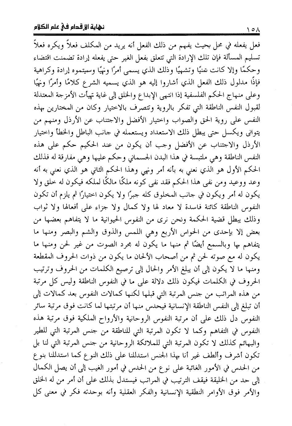 فعل يفعله في محل بحيث يفهم من ذلك الفعل أنه يريد من المكلف فعلا ويكره فعلا تسليم المسألة فإن تلك الإرادة التي تتعلق بفعل الغير حتى يفعله إرادة تضمنت اقتضاء وحكما وإلا كانت تمنيا وتشهيا وذلك الذي يسمى أمرا ونهيا وسميتموه إرادة وكراهية فإذا مدلول ذلك الفعل الذي أشاروا إليه هو الذي يسميه الشرع كلاما وأمرا ونهيا وعلى منهاج الحكم الفلسفية إذا انتهى الإبداع والخلق إلى غاية تهيأت الأمزجة المعتدلة لقبول النفس الناطقة التي تفكر بالروية وتتصرف بالاختيار وكان من المختارين بهذه النفس على روية الحق والصواب واختيار الأفضل والاجتناب عن الأرذل ومنهم من يتوانى ويكسل حتى يبطل ذلك الاستعداد ويستعمله في جانب الباطل والخطأ واختيار الأرذل والاجتناب عن الأفضل وجب أن يكون من عند الحكيم حكم على هذه النفس الناطقة وهي ملتبسة في هذا البدن الجسماني وحكم عليها وهي مفارقة له فذلك الحكم الأول هو الذي نعني به بأنه أمر ونهي وهذا الحكم الثاني هو الذي نعني به أنه وعد ووعيد ومن نفى هذا الحكم فقد نفى كونه ملكا مالكا لملكه فيكون له خلق ولا يكون له أمر ويكون في جانب المخلوق كله جبرا ولا يكون اختيارا ثم يلزم أن تكون النفوس الناطقة كائنة فاسدة لا معاد لها ولا كمال ولا جزاء على أفعالها ولا ثواب وذلك يبطل قضية الحكمة ونحن نرى من النفوس الحيوانية ما لا يتفاهم بعضها من بعض إلا بإحدى من الحواس الأربع وهي اللمس والذوق والشم والبصر ومنها ما يتفاهم بها وبالسمع أيضا ثم منها ما يكون له مجرد الصوت من غير لحن ومنها ما يكون له مع صوته لحن ثم من أصحاب الألحان ما يكون من ذوات الحروف المقطعة ومنها ما لا يكون إلى أن يبلغ الأمر والحال إلى ترصيع الكلمات من الحروف وترتيب الحروف في الكلمات فيكون ذلك دلالة على ما في النفوس الناطقة وليس كل مرتبة من هذه المراتب من جنس المرتبة التي قبلها لكنها كمالات النفوس بعد كمالات إلى أن تبلغ إلى النفس الناطقة الإنسانية فيحدس منها أن مرتبتها لما كانت فوق مرتبة سائر النفوس دل ذلك على أن مرتبة النفوس الروحانية والأرواح الملكية فوق مرتبة هذه النفوس في التفاهم وكما لا تكون المرتبة التي للناطقة من جنس المرتبة التي للطير والبهائم كذلك لا تكون المرتبة التي للملائكة الروحانية من جنس المرتبة التي لنا بل تكون أشرف وألطف غير أنا بهذا الجنس استدللنا على ذلك النوع كما استدللنا بنوع من الحدس في الأمور الغائبة على نوع من الحدس في أمور الغيب إلى أن يصل الكمال إلى حد من الخليقة فيقف الترتيب في المراتب فيستدل بذلك على أن أمر من له الخلق والأمر فوق الأوامر النطقية الإنسانية والفكر العقلية وأنه بوحدته فكر في معنى كل