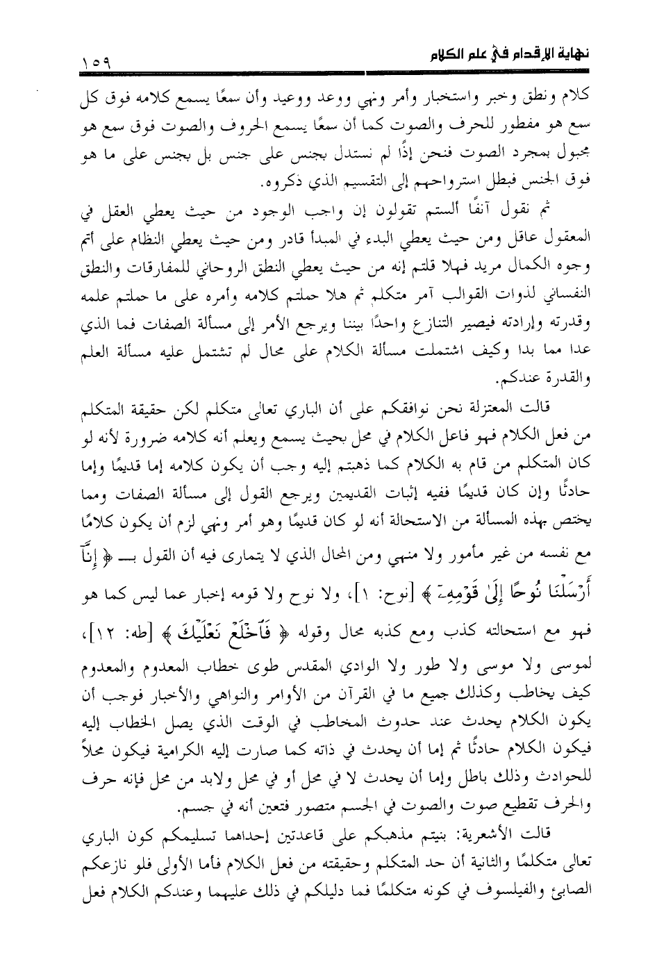 ثم نقول آنفا أ لستم تقولون إن واجب الوجود من حيث يعطي العقل في المعقول عاقل ومن حيث يعطي البدء في المبدأ قادر ومن حيث يعطي النظام على أتم وجوه الكمال مريد فهلا قلتم إنه من حيث يعطي النطق الروحاني للمفارقات والنطق النفساني لذوات القوالب آمر متكلم ثم هلا حملتم كلامه وأمره على ما حملتم علمه وقدرته وإرادته فيصير التنازع واحدا بيننا ويرجع الأمر إلى مسألة الصفات فما الذي عدا مما بدا وكيف اشتملت مسألة الكلام على محال لم تشتمل عليه مسألة العلم والقدرة عندكم.