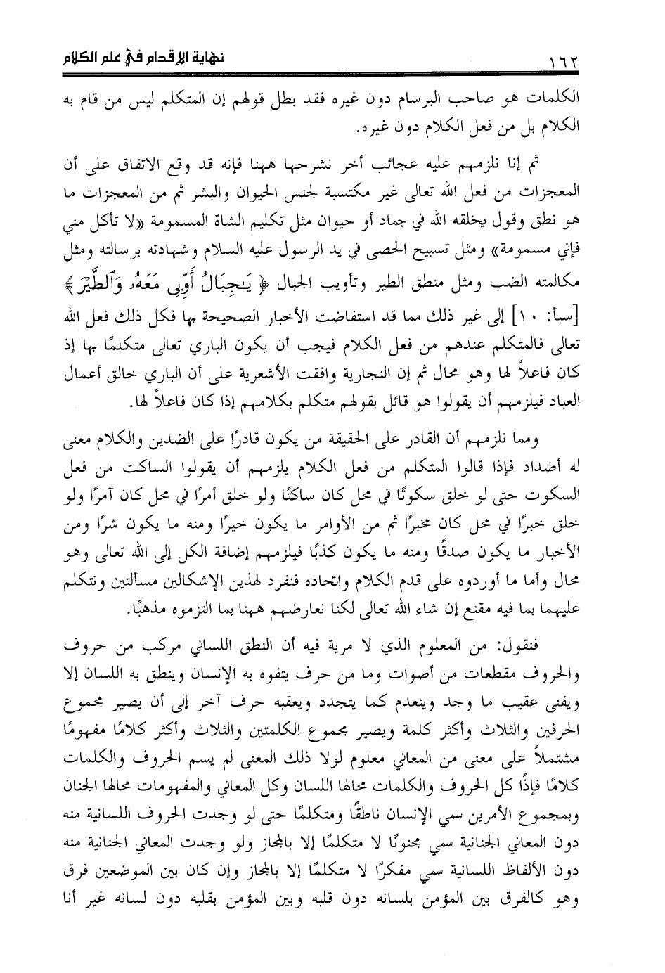 فنقول: من المعلوم الذي لا مرية فيه أن النطق اللساني مركب من حروف والحروف مقطعات من أصوات وما من حرف يتفوه به الإنسان وينطق به اللسان إلا ويفنى عقيب ما وجد وينعدم كما يتجدد ويعقبه حرف آخر إلى أن يصير مجموع الحرفين والثلاث وأكثر كلمة ويصير مجموع الكلمتين والثلاث وأكثر كلاما مفهوما مشتملا على معنى من المعاني معلوم لو لا ذلك المعنى لم يسم الحروف والكلمات كلاما فإذا كل الحروف والكلمات محالها اللسان وكل المعاني والمفهومات محالها الجنان وبمجموع الأمرين سمي الإنسان ناطقا ومتكلما حتى لو وجدت الحروف اللسانية منه دون المعاني الجنانية سمي مجنونا لا متكلما إلا بالمجاز ولو وجدت المعاني الجنانية منه دون الألفاظ اللسانية سمي مفكرا لا متكلما إلا بالمجاز وإن كان بين الموضعين فرق وهو كالفرق بين المؤمن بلسانه دون قلبه وبين المؤمن بقلبه دون لسانه غير أنا