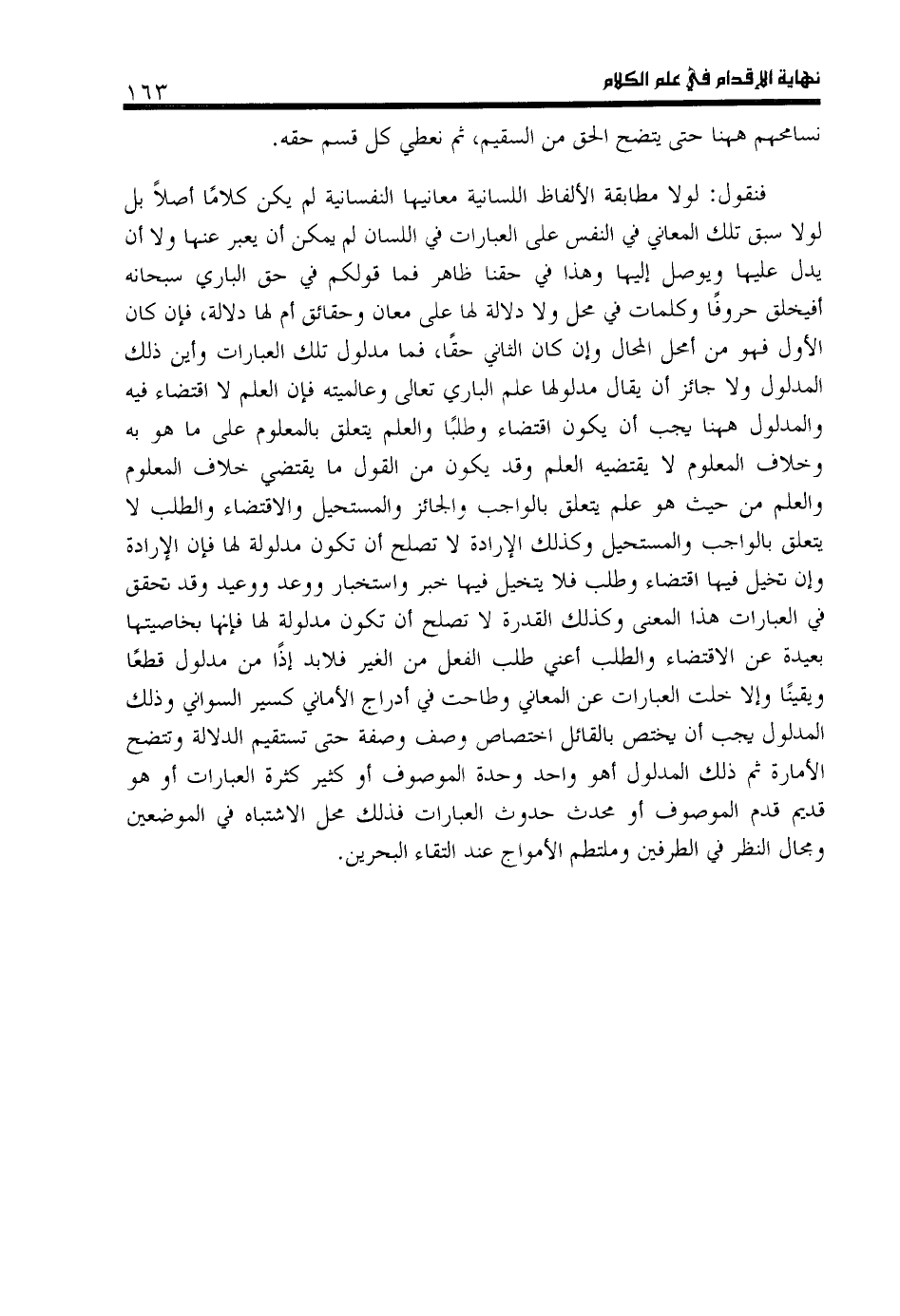 فنقول: لو لا مطابقة الألفاظ اللسانية معانيها النفسانية لم يكن كلاما أصلا بل لو لا سبق تلك المعاني في النفس على العبارات في اللسان لم يمكن أن يعبر عنها ولا أن يدل عليها ويوصل إليها وهذا في حقنا ظاهر فما قولكم في حق الباري سبحانه أ فيخلق حروفا وكلمات في محل ولا دلالة لها على معان وحقائق أم لها دلالة، فإن كان الأول فهو من أمحل المحال وإن كان الثاني حقا، فما مدلول تلك العبارات وأين ذلك المدلول ولا جائز أن يقال مدلولها علم الباري تعالى وعالميته فإن العلم لا اقتضاء فيه والمدلول هاهنا يجب أن يكون اقتضاء وطلبا والعلم يتعلق بالمعلوم على ما هو به وخلاف المعلوم لا يقتضيه العلم وقد يكون من القول ما يقتضي خلاف المعلوم والعلم من حيث هو علم يتعلق بالواجب والجائز والمستحيل والاقتضاء والطلب لا يتعلق بالواجب والمستحيل وكذلك الإرادة لا تصلح أن تكون مدلولة لها فإن الإرادة وإن تخيل فيها اقتضاء وطلب فلا يتخيل فيها خبر واستخبار ووعد ووعيد وقد تحقق في العبارات هذا المعنى وكذلك القدرة لا تصلح أن تكون مدلولة لها فإنها بخاصيتها بعيدة عن الاقتضاء والطلب أعني طلب الفعل من الغير فلا بد إذا من مدلول قطعا ويقينا وإلا خلت العبارات عن المعاني وطاحت في أدراج الأماني كسير السواني وذلك المدلول يجب أن يختص بالقائل اختصاص وصف وصفة حتى تستقيم الدلالة وتتضح الأمارة ثم ذلك المدلول أ هو واحد وحدة الموصوف أو كثير كثرة العبارات أو هو قديم قدم الموصوف أو محدث حدوث العبارات فذلك محل الاشتباه في الموضعين ومجال النظر في الطرفين وملتطم الأمواج عند التقاء البحرين.