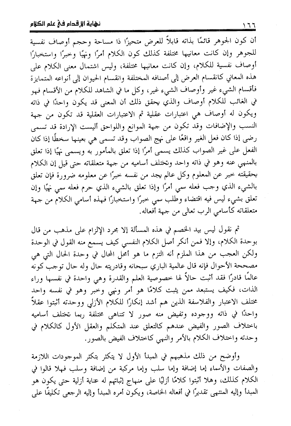 وأوضح من ذلك مذهبهم في المبدأ الأول لا يتكثر بتكثر الموجودات اللازمة والصفات والأسماء إما إضافة وإما سلب وإما مركبة من إضافة وسلب فهلا قالوا في الكلام كذلك، وهلا أثبتوا كلاما أزليا على منهاج إثباتهم له عناية أزلية حتى يكون هو المبدأ وإليه المنتهى تقديرا في أفعاله الخاصة، ويكون أمره المبدأ وإليه الرجعى تكليفا على
