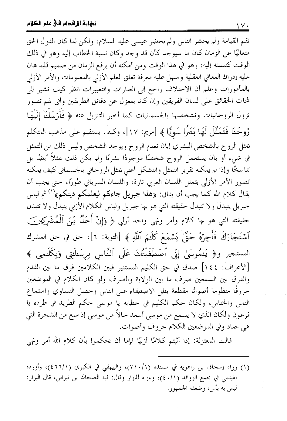تقم القيامة ولم يحشر الناس ولم يحضر عيسى عليه السلام، ولكن لما كان القول الحق متعاليا عن الزمان كان ما سيوجد كأن قد وجد وكان نسبة الخطاب إليه وهو في ذلك الوقت كنسبته إليه، وهو في هذا الوقت ومن أمكنه أن يرفع الزمان من صميم قلبه هان عليه إدراك المعاني العقلية وسهل عليه معرفة تعلق العلم الأزلي بالمعلومات والأمر الأزلي بالمأمورات وعلم أن الاختلاف راجع إلى العبارات والتعبيرات انظر كيف نشير إلى لمحات الحقائق على لسان الفريقين وإن كانا بمعزل عن دقائق الطريقين وأنى لهم تصور نزول الروحانيات وتشخصها بالجسمانيات كما أخبر التنزيل عنه فَأَرْسَلْنا إِلَيْها رُوحَنا فَتَمَثَّلَ لَها بَشَراً سَوِيًّا [مريم: 17]، وكيف يستقيم على مذهب المتكلم تمثل الروح بالشخص البشري إبان تعدم الروح ويوجد الشخص وليس ذلك من التمثل في شي ء أو بأن يستعمل الروح شخصا موجودا بشريا ولم يكن ذلك تمثلا أيضا بل تناسخا وإذا لم يمكنه تقرير التمثل والتشكل أعني تمثل الروحاني بالجسماني كيف يمكنه تصور الأمر الأزلي بتمثل اللسان العربي تارة، واللسان السرياني طورا، حتى يجب أن يقال كلام اللّه كما يجب أن يقال: «هذا جبريل جاءكم ليعلمكم دينكم» «1» ثم لباس جبريل يتبدل ولا تتبدل حقيقته التي هو بها جبريل ولباس الكلام الأزلي يتبدل ولا تتبدل حقيقته التي هو بها كلام وأمر ونهي واحد أزلي وَ إِنْ أَحَدٌ مِنَ الْمُشْرِكِينَ اسْتَجارَكَ فَأَجِرْهُ حَتَّى يَسْمَعَ كَلامَ اللَّهِ [التوبة: 6]، حق في حق المشرك المستجير ويا مُوسى إِنِّي اصْطَفَيْتُكَ عَلَى النَّاسِ بِرِسالاتِي وَ بِكَلامِي [الأعراف: 144] صدق في حق الكليم المستنير فبين الكلامين فرق ما بين القدم والفرق بين السمعين صرف ما بين الولاية والصرف ولو كان الكلام في الموضعين حروفا منظومة أصواتا مقطعة بطل الاصطفاء على الناس وحصل التساوي واستماع الناس والخناس، ولكان حكم الكليم في خطابه يا موسى حكم الطريد في طرده يا فرعون ولكان الذي لا يسمع من موسى أسعد حالا من موسى إذ سمع من الشجرة التي هي جماد وفي الموضعين الكلام حروف وأصوات.
