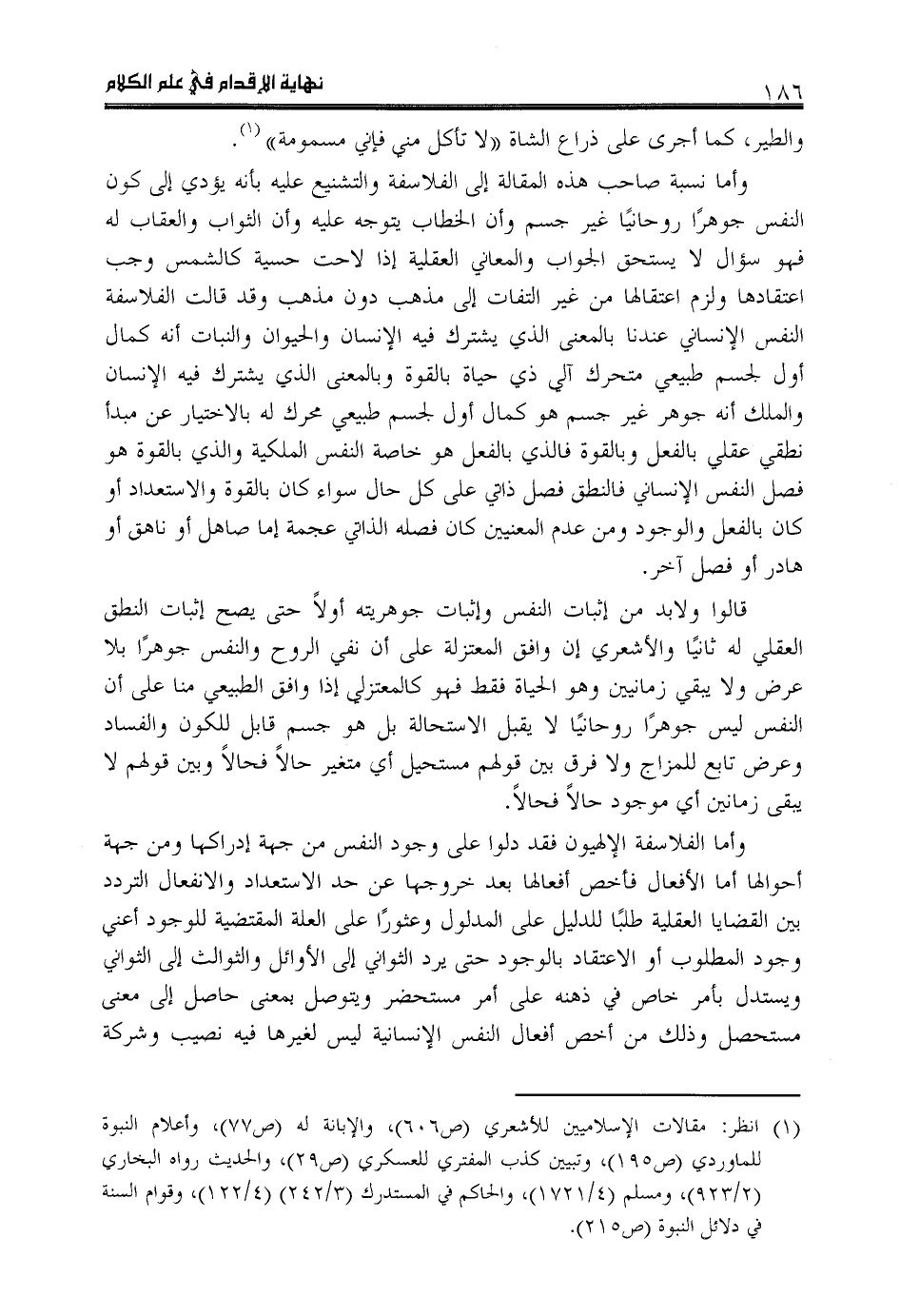 قالوا ولا بد من إثبات النفس وإثبات جوهريته أولا حتى يصح إثبات النطق العقلي له ثانيا والأشعري إن وافق المعتزلة على أن نفي الروح والنفس جوهرا بلا عرض ولا يبقي زمانيين وهو الحياة فقط فهو كالمعتزلي إذا وافق الطبيعي منا على أن النفس ليس جوهرا روحانيا لا يقبل الاستحالة بل هو جسم قابل للكون والفساد وعرض تابع للمزاج ولا فرق بين قولهم مستحيل أي متغير حالا فحالا وبين قولهم لا يبقى زمانين أي موجود حالا فحالا.