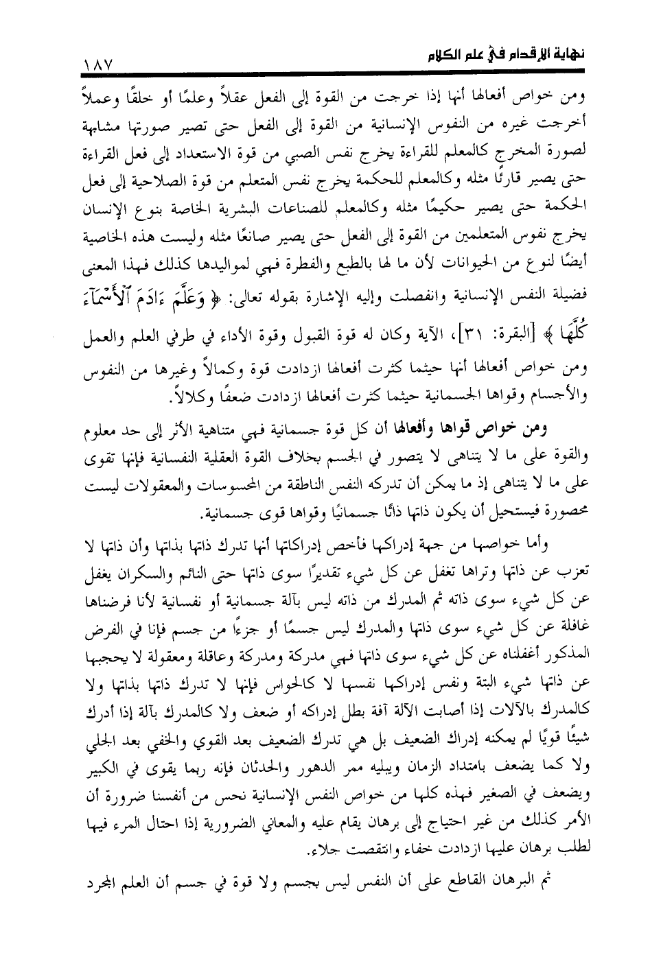 ومن خواص أفعالها أنها إذا خرجت من القوة إلى الفعل عقلا وعلما أو خلقا وعملا أخرجت غيره من النفوس الإنسانية من القوة إلى الفعل حتى تصير صورتها مشابهة لصورة المخرج كالمعلم للقراءة يخرج نفس الصبي من قوة الاستعداد إلى فعل القراءة حتى يصير قارئا مثله وكالمعلم للحكمة يخرج نفس المتعلم من قوة الصلاحية إلى فعل الحكمة حتى يصير حكيما مثله وكالمعلم للصناعات البشرية الخاصة بنوع الإنسان يخرج نفوس المتعلمين من القوة إلى الفعل حتى يصير صانعا مثله وليست هذه الخاصية أيضا لنوع من الحيوانات لأن ما لها بالطبع والفطرة فهي لمواليدها كذلك فهذا المعنى فضيلة النفس الإنسانية وانفصلت وإليه الإشارة بقوله تعالى: وَ عَلَّمَ آدَمَ الْأَسْماءَ كُلَّها [البقرة: 31]، الآية وكان له قوة القبول وقوة الأداء في طرفي العلم والعمل ومن خواص أفعالها أنها حيثما كثرت أفعالها ازدادت قوة وكمالا وغيرها من النفوس والأجسام وقواها الجسمانية حيثما كثرت أفعالها ازدادت ضعفا وكلالا.