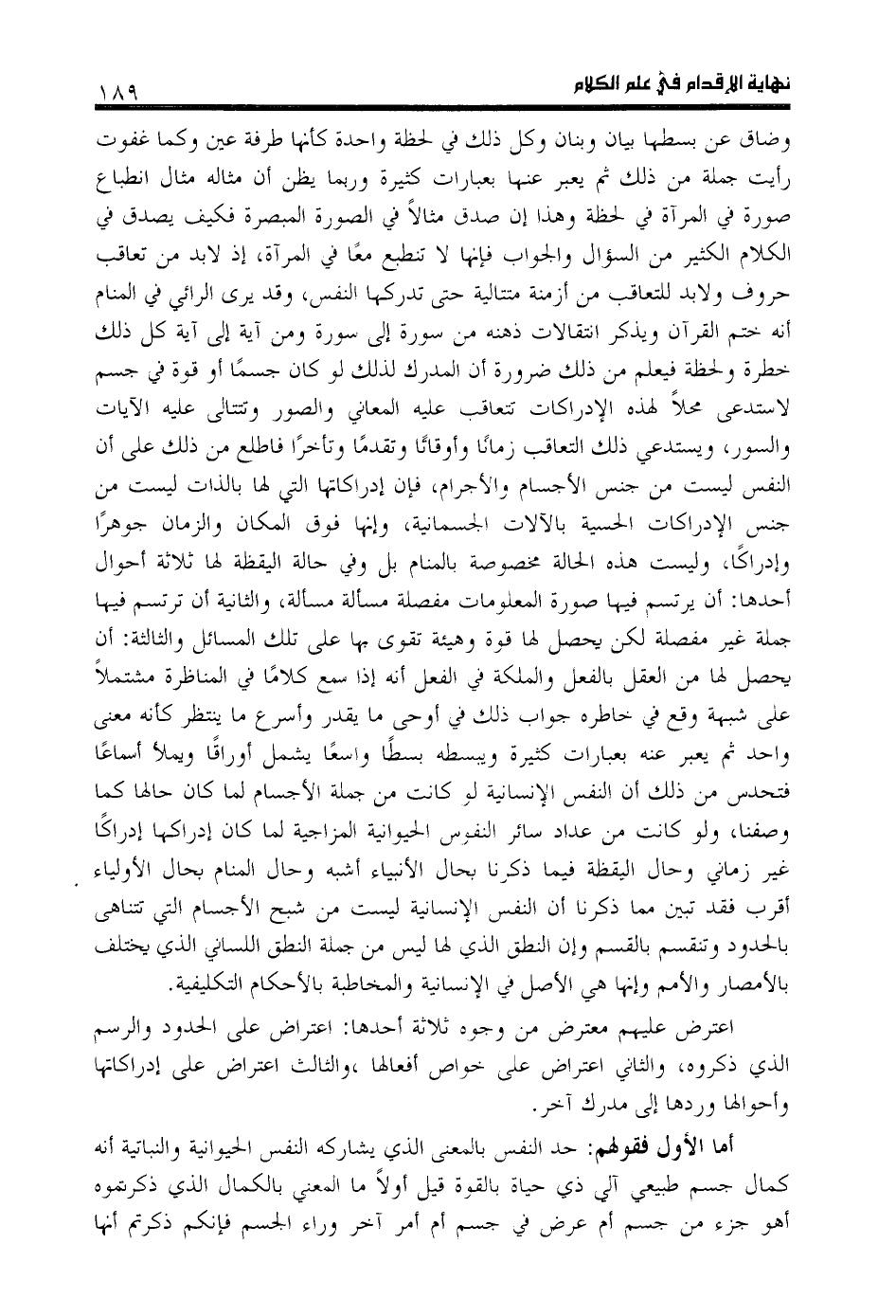 أما الأول فقولهم: حد النفس بالمعنى الذي يشاركه النفس الحيوانية والنباتية أنه كمال جسم طبيعي آلي ذي حياة بالقوة قيل أولا ما المعني بالكمال الذي ذكرتموه أ هو جزء من جسم أم عرض في جسم أم أمر آخر وراء الجسم فإنكم ذكرتم أنها