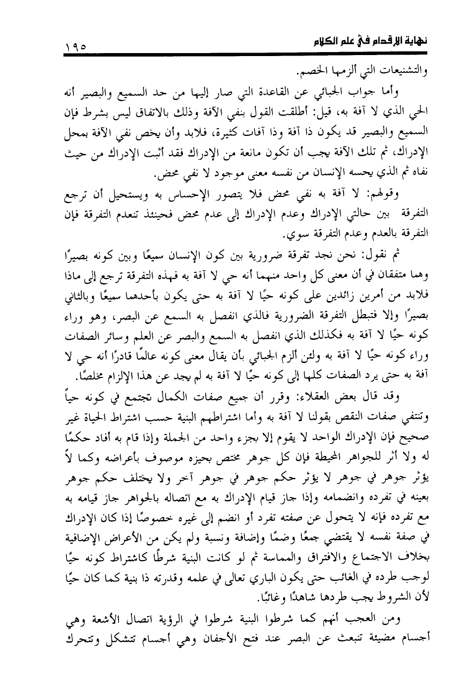 وأما جواب الجبائي عن القاعدة التي صار إليها من حد السميع والبصير أنه الحي الذي لا آفة به، قيل: أطلقت القول بنفي الآفة وذلك بالاتفاق ليس بشرط فإن السميع والبصير قد يكون ذا آفة وذا آفات كثيرة، فلا بد وأن يخص نفي الآفة بمحل الإدراك، ثم تلك الآفة يجب أن تكون مانعة من الإدراك فقد أثبت الإدراك من حيث نفاه ثم الذي يحسه الإنسان من نفسه معنى موجود لا نفي محض.