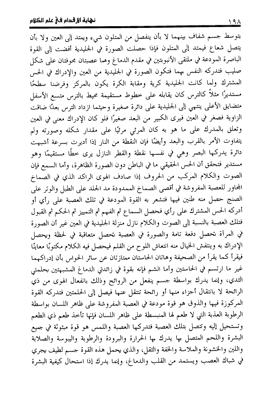 بتوسط جسم شفاف بينهما لا بأن ينفصل من المتلون شي ء ويمتد إلى العين ولا بأن يتصل شعاع فيمتد إلى المتلون فإذا حصلت الصورة في الجليدية أفضت إلى القوة الباصرة المودعة في ملتقى الأنبوبتين في مقدم الدماغ وهما عصبتان مجوفتان على شكل صليب فتدركه النفس بهما فتكون الصورة في الجليدية من العين والإدراك في الحس المشترك ولما كانت الجليدية كرية ومقابة الكرة يكون بالمركز وفرضنا سطحا مستديرا مثلا كالترس كان يقابله على خطوط مستقيمة محيط بالترس متسع الأسفل متضايق الأعلى ينتهي إلى الجليدية على دائرة صغيرة وحيثما ازداد الترس بعدا ضاقت الزاوية فصغر في العين فيرى الكبير من البعد صغيرا فلو كان الإدراك معنى في العين وتعلق بالمدرك على ما هو به كان المرئي مرئيا على مقدار شكله وصورته ولم يتفاوت الأمر بالقرب والبعد وأيضا فإن النقطة من النار إذا أديرت بسرعة أشبهت دائرة يدركها البصر وهي في نفسها نقطة والقطر النازل يرى خطا مستقيما وهو مستدير فتحقق أن الحس الحقيقي ما في الباطن دون الصورة الظاهرة، وأما السمع فإن الصوت والكلام المركب من الحروف إذا صادف الهوى الراكد الذي في الصماخ المجاور للعصبة المفروشة في أقصى الصماخ الممدودة مد الجلد على الطبل والوتر على الصنج حصل منه طنين فيها فتشعر به القوة المودعة في تلك العصبة على رأي أو أدركه الحس المشترك على رأي فحصل السماع ثم الفهم ثم التمييز ثم الحكم ثم القبول فتلك العصبة بالنسبة إلى الصوت والكلام نازل منزلة الجليدية في العين غير أن الصورة في المرآة تحصل دفعة تامة والصورة في العصبة تحصل متعاقبة في لحظة ويحصل الإدراك به وينتفش الخيال منه انتعاش اللوح من القلم فيحصل فيه الكلام مكتوبا معاينا فيقرأ كما يقرأ من الصحيفة وهاتان الحاستان ممتازتان عن سائر الحواس بأن إدراكهما غير ما ارتسم في الحاستين وأما الشم فإنه بقوة في زائدتي الدماغ المشبهتين بحلمتي الثدي، وإنما يدرك بواسطة جسم ينفعل من الروائح وذلك بانفعال الهوى من ذي الرائحة لا بانتقال أجزاء منها أو رائحة تنتقل عنها فيصل إلى الحلمتين فتدركه القوة المركوزة فيها والذوق هو قوة مودعة في العصبة المفروشة على ظاهر اللسان بواسطة الرطوبة العذبة التي لا طعم لها المنبسطة على ظاهر اللسان فإنها تأخذ طعم ذي الطعم وتستحيل إليه وتتصل بتلك العصبة فتدركها العصبة واللمس هو قوة مبثوثة في جميع البشرة واللحم المتصل بها يدرك بها الحرارة والبرودة والرطوبة واليبوسة والصلابة واللين والخشونة والملاسة والخفة والثقل، والذي يحمل هذه القوة جسم لطيف يجري في شباك العصب ويستمد من القلب والدماغ، وإنما يدرك إذا استحال كيفية البشرة