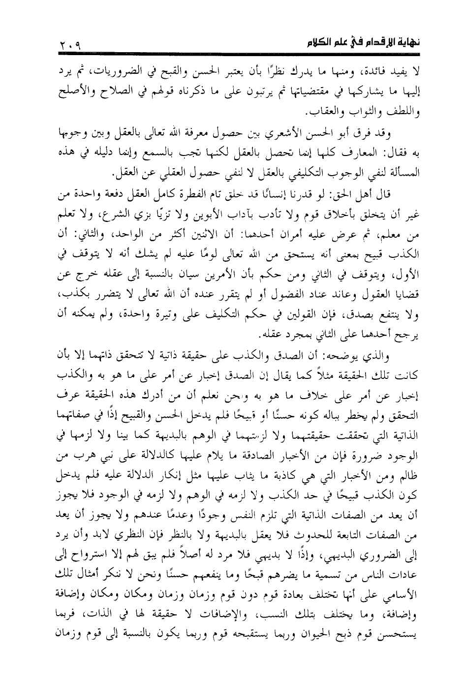 قال أهل الحق: لو قدرنا إنسانا قد خلق تام الفطرة كامل العقل دفعة واحدة من غير أن يتخلق بأخلاق قوم ولا تأدب بآداب الأبوين ولا تزيّا بزي الشرع، ولا تعلم من معلم، ثم عرض عليه أمران أحدهما: أن الاثنين أكثر من الواحد، والثاني: أن الكذب قبيح بمعنى أنه يستحق من اللّه تعالى لوما عليه لم يشك أنه لا يتوقف في الأول، ويتوقف في الثاني ومن حكم بأن الأمرين سيان بالنسبة إلى عقله خرج عن قضايا العقول وعاند عناد الفضول أو لم يتقرر عنده أن اللّه تعالى لا يتضرر بكذب، ولا ينتفع بصدق، فإن القولين في حكم التكليف على وتيرة واحدة، ولم يمكنه أن يرجح أحدهما على الثاني بمجرد عقله.