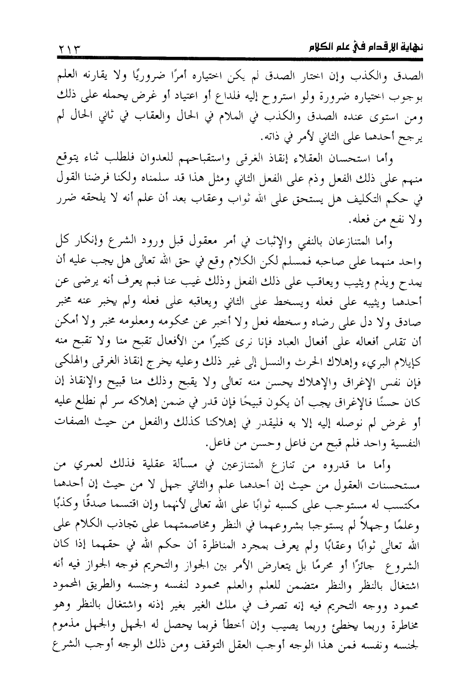 وأما ما قدروه من تنازع المتنازعين في مسألة عقلية فذلك لعمري من مستحسنات العقول من حيث إن أحدهما علم والثاني جهل لا من حيث إن أحدهما مكتسب له مستوجب على كسبه ثوابا على اللّه تعالى لأنهما وإن اقتسما صدقا وكذبا وعلما وجهلا لم يستوجبا بشروعهما في النظر ومخاصمتهما على تجاذب الكلام على اللّه تعالى ثوابا وعقابا ولم يعرف بمجرد المناظرة أن حكم اللّه في حقهما إذا كان الشروع جائزا أو محرما بل يتعارض الأمر بين الجواز والتحريم فوجه الجواز فيه أنه اشتغال بالنظر والنظر متضمن للعلم والعلم محمود لنفسه وجنسه والطريق المحمود محمود ووجه التحريم فيه إنه تصرف في ملك الغير بغير إذنه واشتغال بالنظر وهو مخاطرة وربما يخطئ وربما يصيب وإن أخطأ فربما يحصل له الجهل والجهل مذموم لجنسه ونفسه فمن هذا الوجه أوجب العقل التوقف ومن ذلك الوجه أوجب الشرع