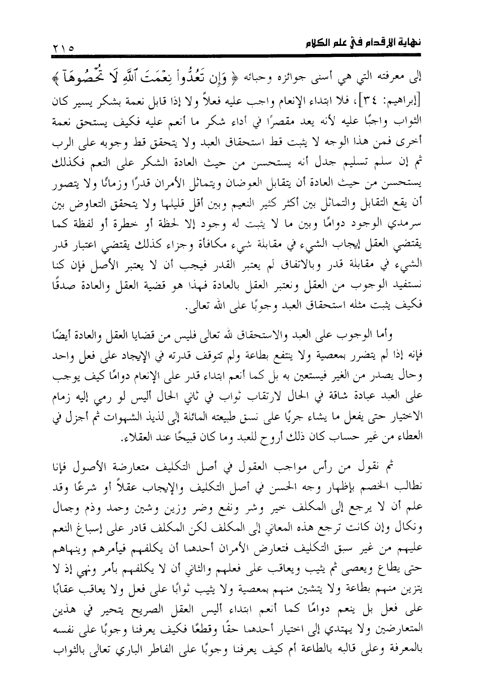إلى معرفته التي هي أسنى جوائزه وحبائه وَ إِنْ تَعُدُّوا نِعْمَتَ اللَّهِ لا تُحْصُوها [إبراهيم: 34]، فلا ابتداء الإنعام واجب عليه فعلا ولا إذا قابل نعمة بشكر يسير كان الثواب واجبا عليه لأنه يعد مقصرا في أداء شكر ما أنعم عليه فكيف يستحق نعمة أخرى فمن هذا الوجه لا يثبت قط استحقاق العبد ولا يتحقق قط وجوبه على الرب ثم إن سلم تسليم جدل أنه يستحسن من حيث العادة الشكر على النعم فكذلك يستحسن من حيث العادة أن يتقابل العوضان ويتماثل الأمران قدرا وزمانا ولا يتصور أن يقع التقابل والتماثل بين أكثر كثير النعيم وبين أقل قليلها ولا يتحقق التعاوض بين سرمدي الوجود دواما وبين ما لا يثبت له وجود إلا لحظة أو خطرة أو لفظة كما يقتضي العقل إيجاب الشي ء في مقابلة شي ء مكافأة وجزاء كذلك يقتضي اعتبار قدر الشي ء في مقابلة قدر وبالاتفاق لم يعتبر القدر فيجب أن لا يعتبر الأصل فإن كنا نستفيد الوجوب من العقل ونعتبر العقل بالعادة فهذا هو قضية العقل والعادة صدقا فكيف يثبت مثله استحقاق العبد وجوبا على اللّه تعالى.