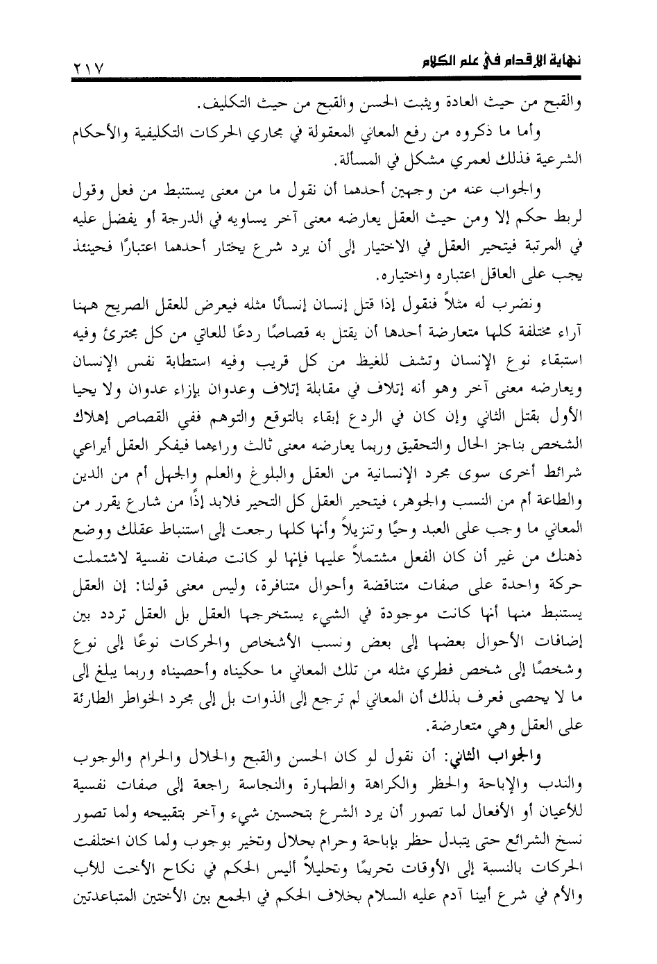 والجواب الثاني: أن نقول لو كان الحسن والقبح والحلال والحرام والوجوب والندب والإباحة والحظر والكراهة والطهارة والنجاسة راجعة إلى صفات نفسية للأعيان أو الأفعال لما تصور أن يرد الشرع بتحسين شي ء وآخر بتقبيحه ولما تصور نسخ الشرائع حتى يتبدل حظر بإباحة وحرام بحلال وتخير بوجوب ولما كان اختلفت الحركات بالنسبة إلى الأوقات تحريما وتحليلا أ ليس الحكم في نكاح الأخت للأب والأم في شرع أبينا آدم عليه السلام بخلاف الحكم في الجمع بين الأختين المتباعدتين