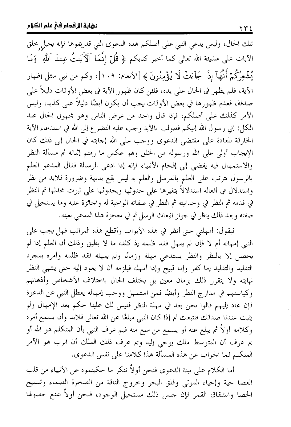 تلك الحال، وليس يدعي النبي على أصلكم هذه الدعوى التي قدرتموها فإنه يحيل خلق الآيات على مشيئة اللّه تعالى كما أخبر كتابكم قُلْ إِنَّمَا الْآياتُ عِنْدَ اللَّهِ وَ ما يُشْعِرُكُمْ أَنَّها إِذا جاءَتْ لا يُؤْمِنُونَ [الأنعام: 109]، وكم من نبي سئل إظهار الآية، فلم يظهر في الحال على يده، فلئن كان ظهور الآية في بعض الأوقات دليلا على صدقه، فعدم ظهورها في بعض الأوقات يجب أن يكون أيضا دليلا على كذبه، وليس الأمر كذلك على أصلكم، فإذا قال واحد من عرض الناس وهو مجهول الحال عند الكل: إني رسول اللّه إليكم فطولب بالآية وجب عليه التضرع إلى اللّه في استدعاء الآية الخارقة للعادة على مقتضى الدعوى ووجب على اللّه إجابته في الحال إلى ذلك كان الإيجاب أولى على اللّه ورسوله من الخلق وهو عكس ما رمتم إثباته ثم مسألة النظر والاستمهال فيه يفضي إلى إفحام الأنبياء فإنه إذا ادعى الرسالة فقال المدعو العلم بالرسول يترتب على العلم بالمرسل والعلم به ليس يقع بديهة وضرورة فلا بد من نظر واستدلال في أفعاله استدلالا بتغيرها على حدوثها وبحدوثها على ثبوت محدثها ثم النظر في قدمه ثم النظر في وحدانيته ثم النظر في صفاته الواجبة له والجائزة عليه وما يستحيل في صفته وبعد ذلك ينظر في جواز انبعاث الرسل ثم في معجزة هذا المدعي بعينه.