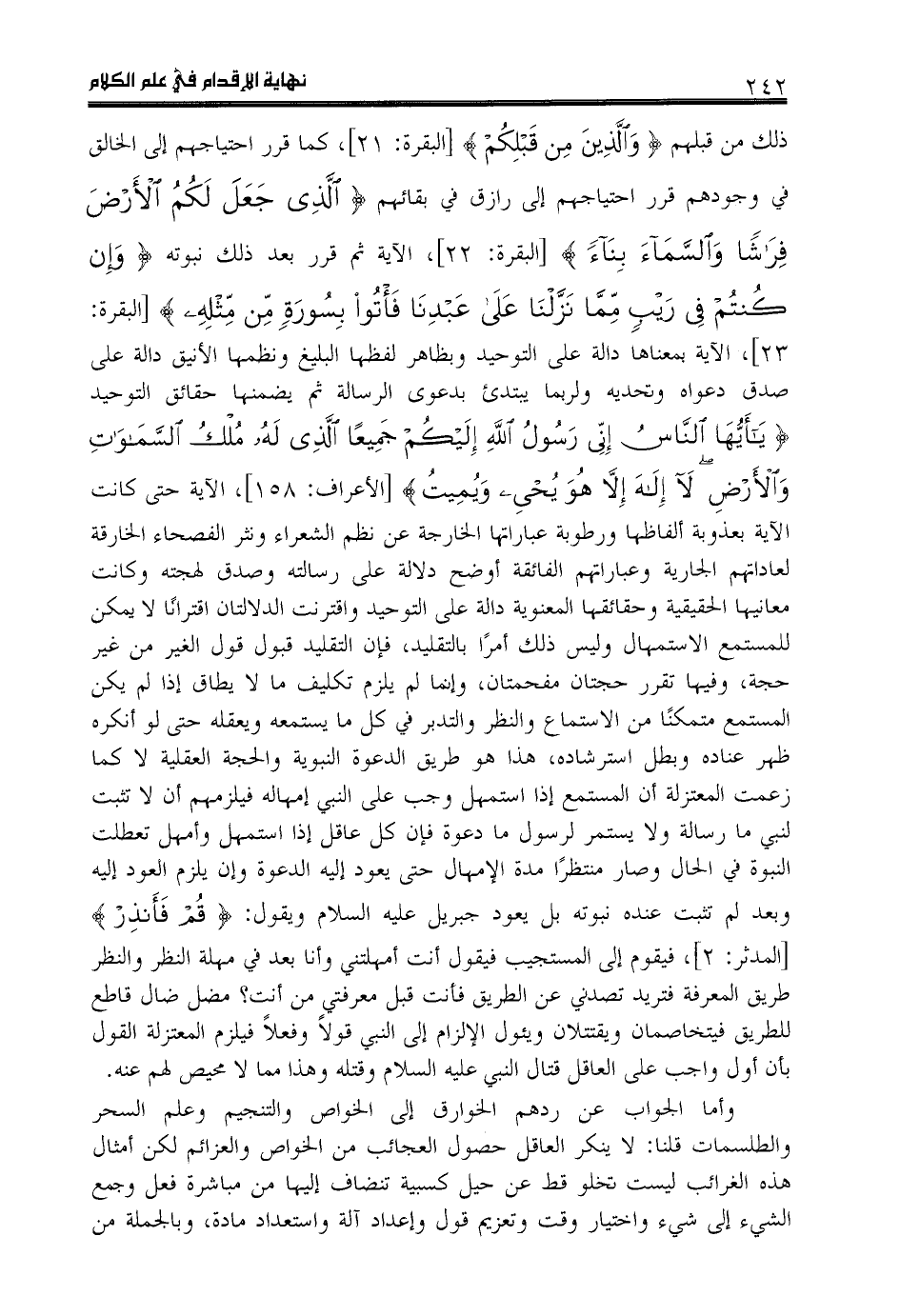 23]، الآية بمعناها دالة على التوحيد وبظاهر لفظها البليغ ونظمها الأنيق دالة على صدق دعواه وتحديه ولربما يبتدئ بدعوى الرسالة ثم يضمنها حقائق التوحيد يا أَيُّهَا النَّاسُ إِنِّي رَسُولُ اللَّهِ إِلَيْكُمْ جَمِيعاً الَّذِي لَهُ مُلْكُ السَّماواتِ وَ الْأَرْضِ لا إِلهَ إِلَّا هُوَ يُحيِي وَ يُمِيتُ [الأعراف: 158]، الآية حتى كانت الآية بعذوبة ألفاظها ورطوبة عباراتها الخارجة عن نظم الشعراء ونثر الفصحاء الخارقة لعاداتهم الجارية وعباراتهم الفائقة أوضح دلالة على رسالته وصدق لهجته وكانت معانيها الحقيقية وحقائقها المعنوية دالة على التوحيد واقترنت الدلالتان اقترانا لا يمكن للمستمع الاستمهال وليس ذلك أمرا بالتقليد، فإن التقليد قبول قول الغير من غير حجة، وفيها تقرر حجتان مفحمتان، وإنما لم يلزم تكليف ما لا يطاق إذا لم يكن المستمع متمكنا من الاستماع والنظر والتدبر في كل ما يستمعه ويعقله حتى لو أنكره ظهر عناده وبطل استرشاده، هذا هو طريق الدعوة النبوية والحجة العقلية لا كما زعمت المعتزلة أن المستمع إذا استمهل وجب على النبي إمهاله فيلزمهم أن لا تثبت لنبي ما رسالة ولا يستمر لرسول ما دعوة فإن كل عاقل إذا استمهل وأمهل تعطلت النبوة في الحال وصار منتظرا مدة الإمهال حتى يعود إليه الدعوة وإن يلزم العود إليه وبعد لم تثبت عنده نبوته بل يعود جبريل عليه السلام ويقول: قُمْ فَأَنْذِرْ [المدثر: 2]، فيقوم إلى المستجيب فيقول أنت أمهلتني وأنا بعد في مهلة النظر والنظر طريق المعرفة فتريد تصدني عن الطريق فأنت قبل معرفتي من أنت؟ مضل ضال قاطع للطريق فيتخاصمان ويقتتلان ويئول الإلزام إلى النبي قولا وفعلا فيلزم المعتزلة القول بأن أول واجب على العاقل قتال النبي عليه السلام وقتله وهذا مما لا محيص لهم عنه.
