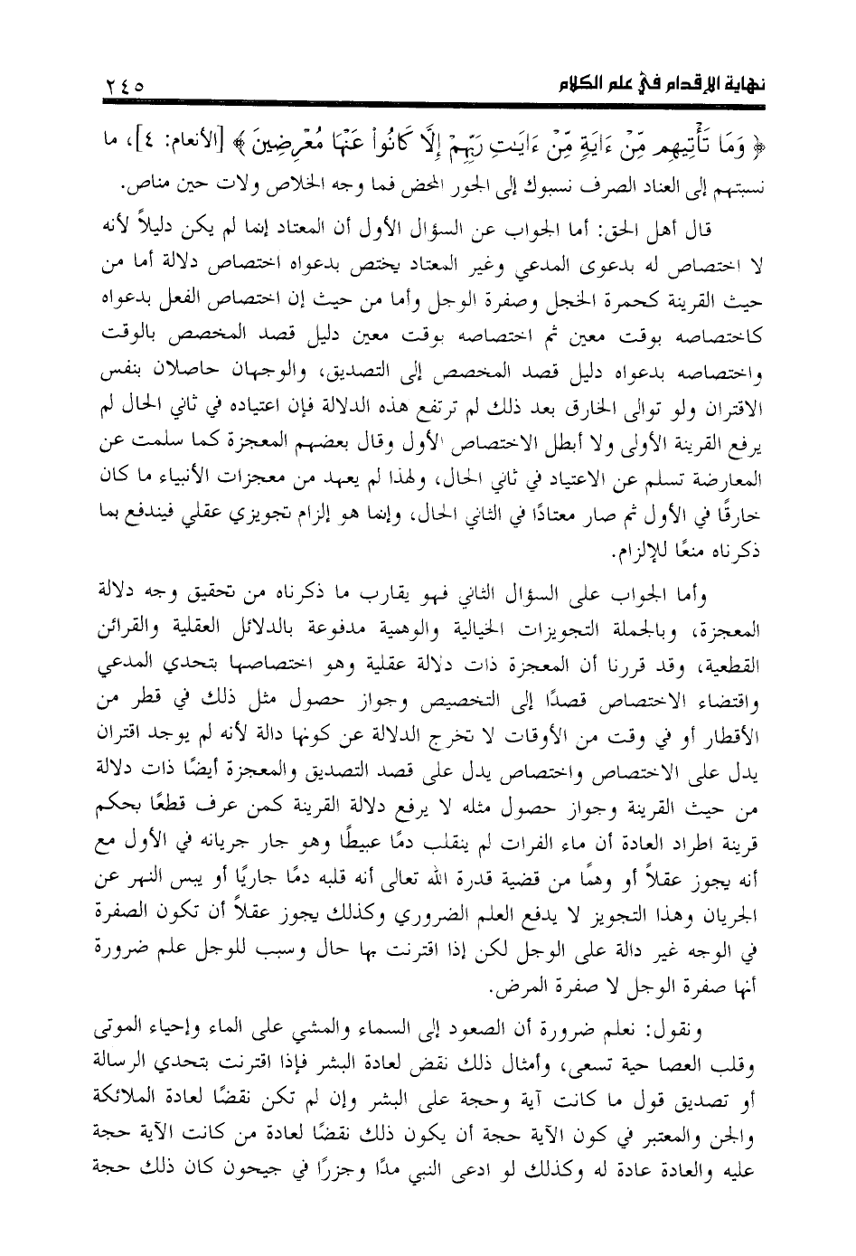 ونقول: نعلم ضرورة أن الصعود إلى السماء والمشي على الماء وإحياء الموتى وقلب العصا حية تسعى، وأمثال ذلك نقض لعادة البشر فإذا اقترنت بتحدي الرسالة أو تصديق قول ما كانت آية وحجة على البشر وإن لم تكن نقضا لعادة الملائكة والجن والمعتبر في كون الآية حجة أن يكون ذلك نقضا لعادة من كانت الآية حجة عليه والعادة عادة له وكذلك لو ادعى النبي مدا وجزرا في جيحون كان ذلك حجة