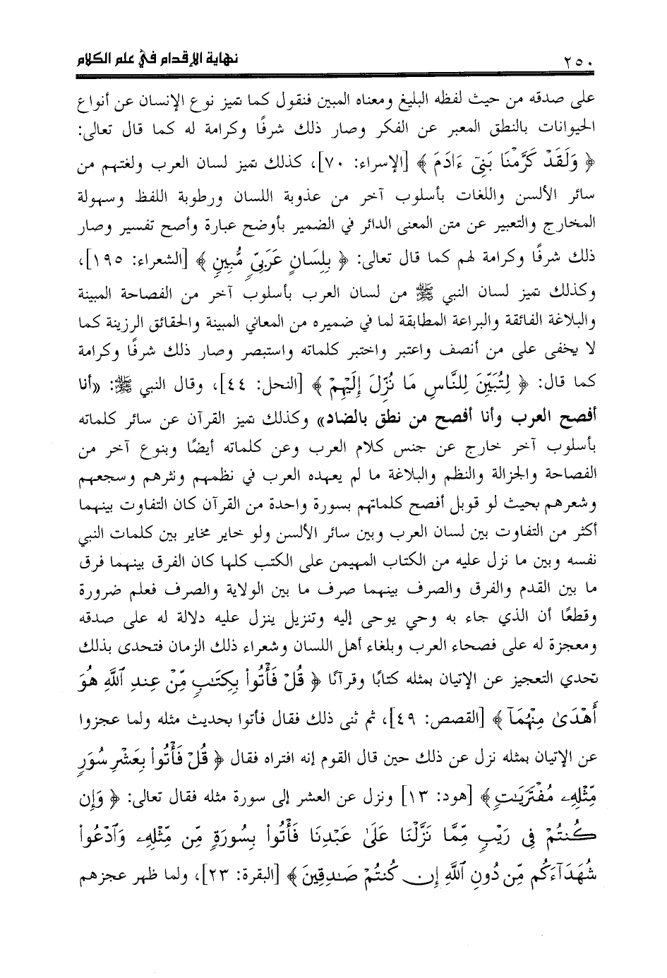 وَ لَقَدْ كَرَّمْنا بَنِي آدَمَ [الإسراء: 70]، كذلك تميز لسان العرب ولغتهم من سائر الألسن واللغات بأسلوب آخر من عذوبة اللسان ورطوبة اللفظ وسهولة المخارج والتعبير عن متن المعنى الدائر في الضمير بأوضح عبارة وأصح تفسير وصار ذلك شرفا وكرامة لهم كما قال تعالى: بِلِسانٍ عَرَبِيٍّ مُبِينٍ [الشعراء: 195]، وكذلك تميز لسان النبي صلى اللّه عليه وسلم من لسان العرب بأسلوب آخر من الفصاحة المبينة والبلاغة الفائقة والبراعة المطابقة لما في ضميره من المعاني المبينة والحقائق الرزينة كما لا يخفى على من أنصف واعتبر واختبر كلماته واستبصر وصار ذلك شرفا وكرامة كما قال: لِتُبَيِّنَ لِلنَّاسِ ما نُزِّلَ إِلَيْهِمْ [النحل: 44]، وقال النبي صلى اللّه عليه وسلم: «أنا أفصح العرب وأنا أفصح من نطق بالضاد» وكذلك تميز القرآن عن سائر كلماته بأسلوب آخر خارج عن جنس كلام العرب وعن كلماته أيضا وبنوع آخر من الفصاحة والجزالة والنظم والبلاغة ما لم يعهده العرب في نظمهم ونثرهم وسجعهم وشعرهم بحيث لو قوبل أفصح كلماتهم بسورة واحدة من القرآن كان التفاوت بينهما أكثر من التفاوت بين لسان العرب وبين سائر الألسن ولو خاير مخاير بين كلمات النبي نفسه وبين ما نزل عليه من الكتاب المهيمن على الكتب كلها كان الفرق بينهما فرق ما بين القدم والفرق والصرف بينهما صرف ما بين الولاية والصرف فعلم ضرورة وقطعا أن الذي جاء به وحي يوحى إليه وتنزيل ينزل عليه دلالة له على صدقه ومعجزة له على فصحاء العرب وبلغاء أهل اللسان وشعراء ذلك الزمان فتحدى بذلك تحدي التعجيز عن الإتيان بمثله كتابا وقرآنا قُلْ فَأْتُوا بِكِتابٍ مِنْ عِنْدِ اللَّهِ هُوَ أَهْدى مِنْهُما [القصص: 49]، ثم ثنى ذلك فقال فأتوا بحديث مثله ولما عجزوا عن الإتيان بمثله نزل عن ذلك حين قال القوم إنه افتراه فقال قُلْ فَأْتُوا بِعَشْرِ سُوَرٍ مِثْلِهِ مُفْتَرَياتٍ [هود: 13] ونزل عن العشر إلى سورة مثله فقال تعالى: وَ إِنْ كُنْتُمْ فِي رَيْبٍ مِمَّا نَزَّلْنا عَلى عَبْدِنا فَأْتُوا بِسُورَةٍ مِنْ مِثْلِهِ وَ ادْعُوا شُهَداءَكُمْ مِنْ دُونِ اللَّهِ إِنْ كُنْتُمْ صادِقِينَ [البقرة: 23]، ولما ظهر عجزهم