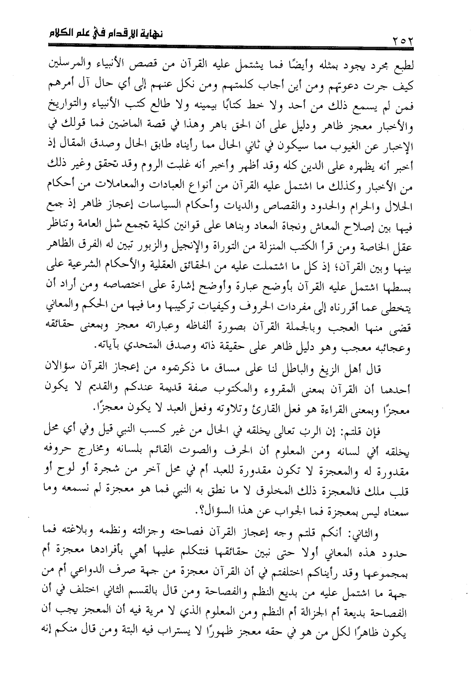 فإن قلتم: إن الرب تعالى يخلقه في الحال من غير كسب النبي قيل وفي أي محل يخلقه أ في لسانه ومن المعلوم أن الحرف والصوت القائم بلسانه ومخارج حروفه مقدورة له والمعجزة لا تكون مقدورة للعبد أم في محل آخر من شجرة أو لوح أو قلب ملك فالمعجزة ذلك المخلوق لا ما نطق به النبي فما هو معجزة لم نسمعه وما سمعناه ليس بمعجزة فما الجواب عن هذا السؤال؟.