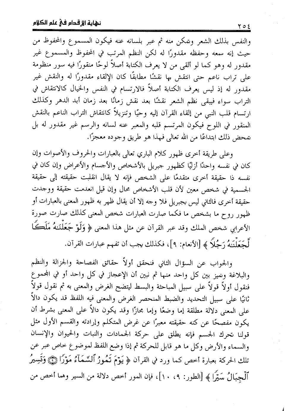 والنفس بذلك الشعر وتمكن منه ثم عبر بلسانه عنه فيكون المسموع والمحفوظ من حيث إنه سمعه وحفظه مقدورا له لكن النظم المرتب في المحفوظ والمسموع غير مقدور له وهو كما لو ألقى من لا يعرف الكتابة أصلا لوحا منقورا فيه سور منظومة على تراب ناعم حتى انتقش بها نقشا مطابقا كان الإلقاء مقدورا له والنقش غير مقدور له إذ ليس يعرف الكتابة أصلا فالارتسام في النفس والخيال كالانتقاش في التراب سواء فيبقى نظم الشعر نقشا بعد نقش زمانا بعد زمان أبد الدهر وكذلك ارتسام قلب النبي من إلقاء القرآن إليه وحيا وتنزيلا كانتقاش التراب الناعم بالنقش المنقور في اللوح فيكون المرتسم قلبه والمعبر عنه لسانه والرسم غير مقدور له بل تمحض ذلك ابتداعا من اللّه تعالى فهذا هو طريق وجوده معجزا.