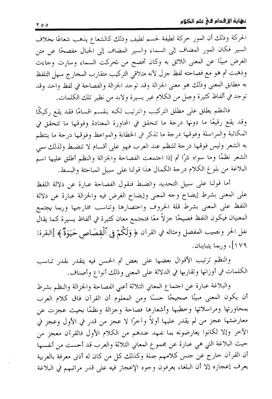 فالنظم يطلق على مطلق التركيب والترتيب لكنه ينقسم اقساما فقد يقع ركيكا وقد يقع رقيعا ما دونها درجة ما تتحقق في المحاورة المعتادة وفوقها ما تتحقق في المكاتبة والمراسلة وفوقها درجة ما تذكر في الخطابة والمواعظ وفوقها درجة ما ينتظم به الشعر وليس فوقها درجة للنظم عند العرب فهو على أقسام لا تنضبط ولذلك سمي الشعر نظما وما سواه نثرا ثم إذا اجتمعت الفصاحة والجزالة والنظم أطلق عليها اسم البلاغة من بلوغ الكلام درجة الكمال هذا قولنا على سبيل المباحثة والبسط.