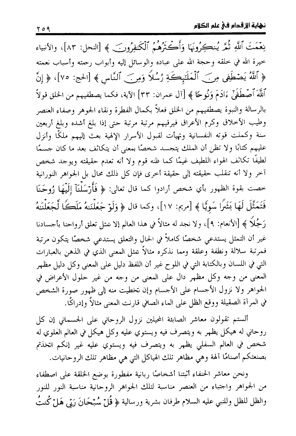 نِعْمَتَ اللَّهِ ثُمَّ يُنْكِرُونَها وَ أَكْثَرُهُمُ الْكافِرُونَ [النحل: 83]، والأنبياء خيرة اللّه في خلقه وحجة اللّه على عباده والوسائل إليه وأبواب رحمته وأسباب نعمته اللَّهُ يَصْطَفِي مِنَ الْمَلائِكَةِ رُسُلًا وَ مِنَ النَّاسِ [الحج: 75]، إِنَّ اللَّهَ اصْطَفى آدَمَ وَ نُوحاً [آل عمران: 33] الآية، فكما يصطفيهم من الخلق قولا بالرسالة والنبوة يصطفيهم من الخلق فعلا بكمال الفطرة ونقاء الجوهر وصفاء العنصر وطيب الأخلاق وكرم الأعراق فيرقيهم مرتبة مرتبة حتى إذا بلغ أشده وبلغ أربعين سنة وكملت قوته النفسانية وتهيأت لقبول الأسرار الإلهية بعث إليهم ملكا وأنزل عليهم كتابا ولا تظن أن الملك يتجسد شخصا بمعنى أن يتكاثف بعد ما كان جسما لطيفا تكاثف الهواء اللطيف غيما كما ظنه قوم ولا أنه تعدم حقيقته ويوجد شخص آخر ولا أنه تنقلب حقيقته إلى حقيقة أخرى فإن كل ذلك محال بل الجواهر النورانية خصت بقوة الظهور بأي شخص أرادوا كما قال تعالى: فَأَرْسَلْنا إِلَيْها رُوحَنا فَتَمَثَّلَ لَها بَشَراً سَوِيًّا [مريم: 17]، وكما قال وَ لَوْ جَعَلْناهُ مَلَكاً لَجَعَلْناهُ رَجُلًا [الأنعام: 9]، ولا نجد له مثالا في هذا العالم إلا تمثل تعلق أرواحنا بأجسادنا غير أن التمثل يستدعي شخصا كاملا في الحال والتعلق يستدعي شخصا يتكون مرتبة فمرتبة سلالة ونطفة وعلقة ومما نذكره مثالا تمثل المعنى الذي في الذهن بالعبارات التي في اللسان وبالكتابة التي في اللوح غير أن اللفظ دليل على المعنى وكل دليل مظهر المعنى من وجه وكل مظهر دال على المعنى من وجه من غير حلول الأعراض في الجواهر ولا نزول الأجسام على الأجسام وإن تخطيت منه إلى ظهور صورة الشخص في المرآة الصقيلة ووقع الظل على الماء الصافي قارنت المعنى مثالا وإدراكا.