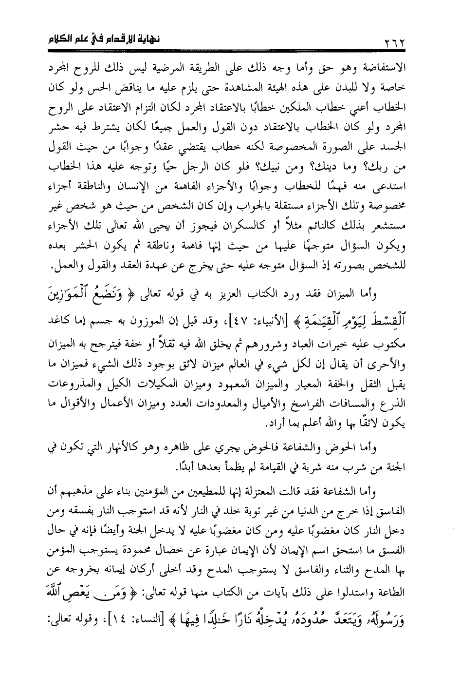 الاستفاضة وهو حق وأما وجه ذلك على الطريقة المرضية ليس ذلك للروح المجرد خاصة ولا للبدن على هذه الهيئة المشاهدة حتى يلزم عليه ما يناقض الحس ولو كان الخطاب أعني خطاب الملكين خطابا بالاعتقاد المجرد لكان التزام الاعتقاد على الروح المجرد ولو كان الخطاب بالاعتقاد دون القول والعمل جميعا لكان يشترط فيه حشر الجسد على الصورة المخصوصة لكنه خطاب يقتضي عقدا وجوابا من حيث القول من ربك؟ وما دينك؟ ومن نبيك؟ فلو كان الرجل حيا وتوجه عليه هذا الخطاب استدعى منه فهما للخطاب وجوابا والأجزاء الفاهمة من الإنسان والناطقة أجزاء مخصوصة وتلك الأجزاء مستقلة بالجواب وإن كان الشخص من حيث هو شخص غير مستشعر بذلك كالنائم مثلا أو كالسكران فيجوز أن يحيى اللّه تعالى تلك الأجزاء ويكون السؤال متوجها عليها من حيث إنها فاهمة وناطقة ثم يكون الحشر بعده للشخص بصورته إذ السؤال متوجه عليه حتى يخرج عن عهدة العقد والقول والعمل.