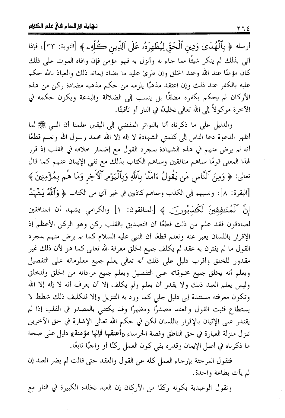 والدليل على ما ذكرناه أنا بالتواتر المفضي إلى اليقين علمنا أن النبي صلى اللّه عليه وسلم لما أظهر الدعوة دعا الناس إلى كلمتي الشهادة لا إله إلا اللّه محمد رسول اللّه ونعلم قطعا أنه لم يرض منهم في هذه الشهادة بمجرد القول مع إضمار خلافه في القلب إذ قرر لهذا المعنى قوما سماهم منافقين وسماهم الكتاب بذلك مع نفي الإيمان عنهم كما قال تعالى: وَ مِنَ النَّاسِ مَنْ يَقُولُ آمَنَّا بِاللَّهِ وَ بِالْيَوْمِ الْآخِرِ وَ ما هُمْ بِمُؤْمِنِينَ [البقرة: 8]، ونسبهم إلى الكذب وسماهم كاذبين في غير آي من الكتاب وَ اللَّهُ يَشْهَدُ إِنَّ الْمُنافِقِينَ لَكاذِبُونَ [المنافقون: 1] والكرامي يشهد أن المنافقين لصادقون فقد علم من ذلك قطعا أن التصديق بالقلب ركن وهو الركن الأعظم إذ الإقرار باللسان يعبر عنه ونعلم قطعا أن النبي عليه السلام كما لم يرض منهم بمجرد القول ما لم يقترن به عقد لم يكلف جميع الخلق معرفة اللّه تعالى كما هو لأن ذلك غير مقدور للخلق وأقرب دليل على ذلك أنه تعالى يعلم جميع معلوماته على التفصيل ويعلم أنه يخلق جميع مخلوقاته على التفصيل ويعلم جميع مراداته من الخلق وللخلق وليس يعلم العبد ذلك ولا يقدر أن يعلم ولم يكلف إلا أن يعرف أنه لا إله إلا اللّه وتكون معرفته مستندة إلى دليل جلي كما ورد به التنزيل وإلا فتكليف ذلك شطط لا يستطاع فثبت القول والعقد مصدرا ومظهرا وقد يكتفي بالمصدر في القلب إذا لم يقتدر على الإتيان بالإقرار باللسان لكن في حكم اللّه تعالى الإشارة في حق الآخرين تنزل منزلة العبارة في حق الناطق وقصة الخرساء «أعتقها فإنها مؤمنة» دليل على صحة ما ذكرناه في أصل الإيمان وقدره بقي كون العمل ركنا أو واجبا تابعا.