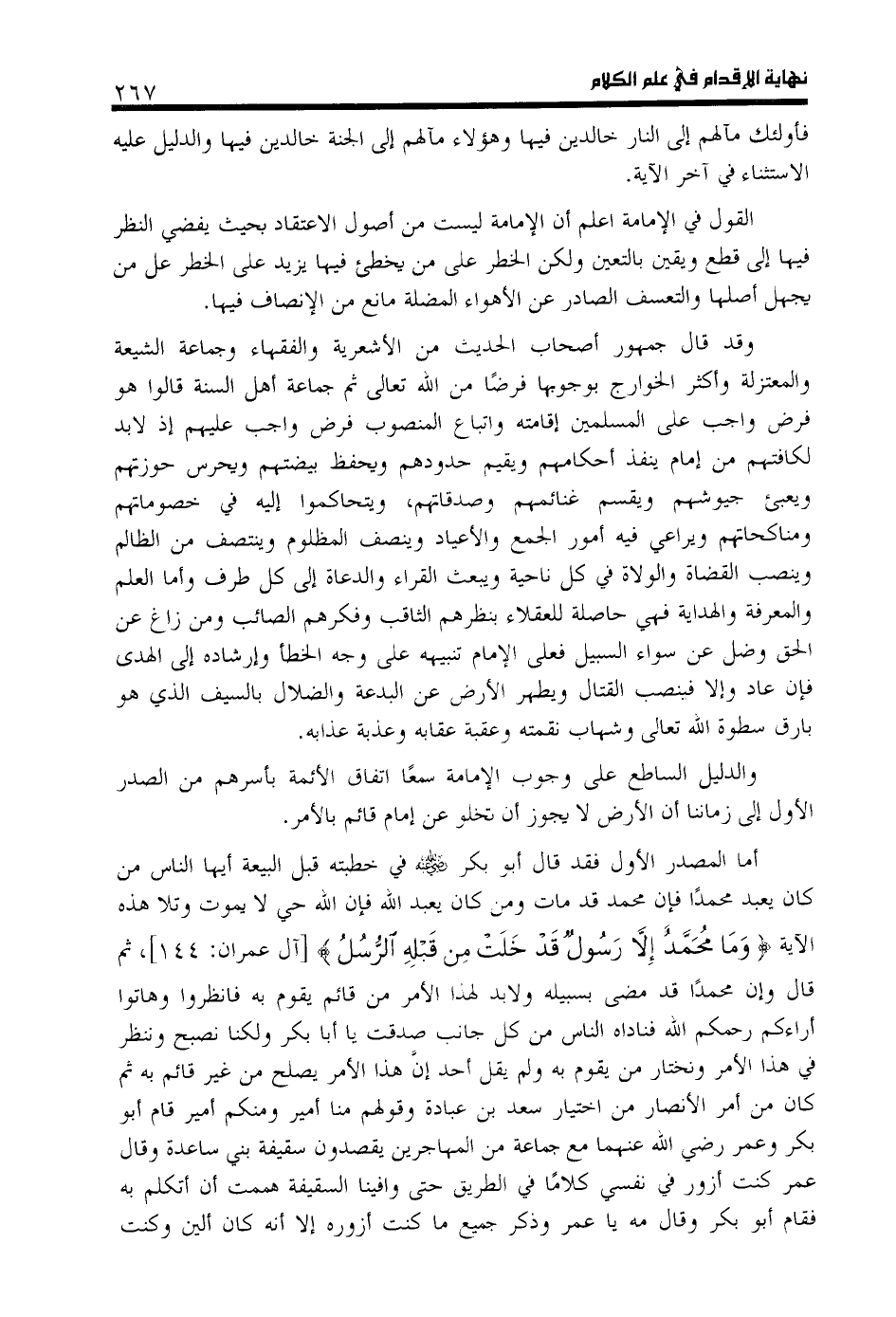 القول في الإمامة اعلم أن الإمامة ليست من أصول الاعتقاد بحيث يفضي النظر فيها إلى قطع ويقين بالتعين ولكن الخطر على من يخطئ فيها يزيد على الخطر عل من يجهل أصلها والتعسف الصادر عن الأهواء المضلة مانع من الإنصاف فيها.